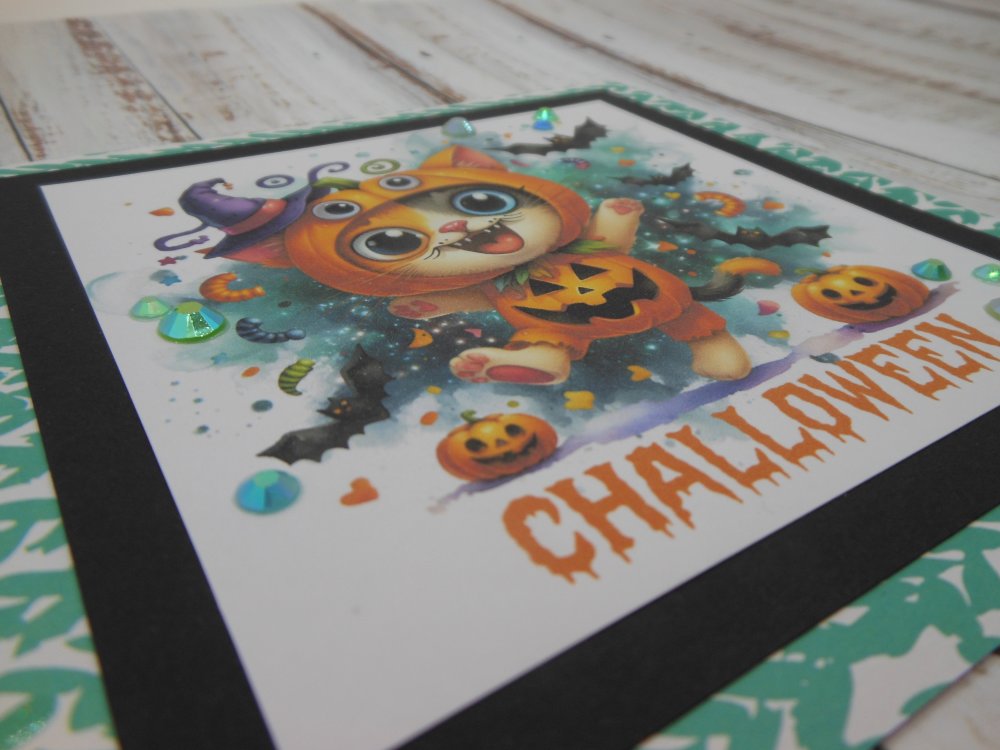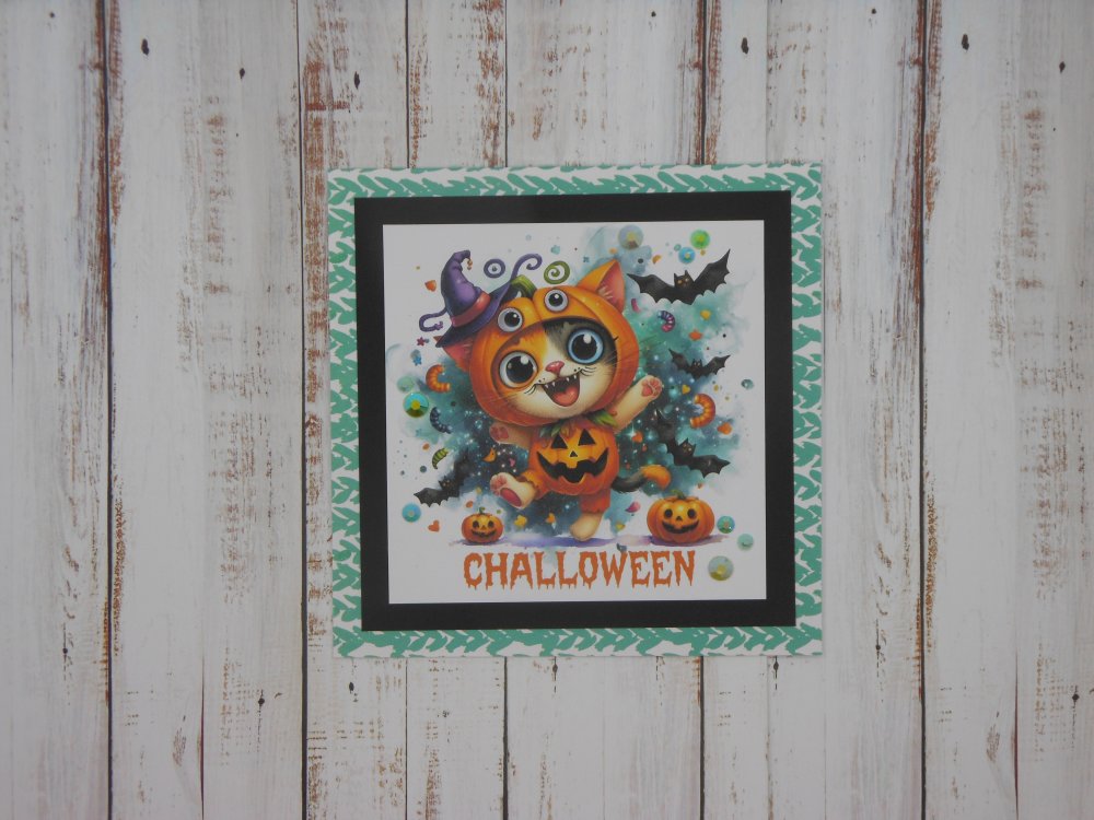 Carte chat halloween déguisé en citrouille, fond noir et vert fait main