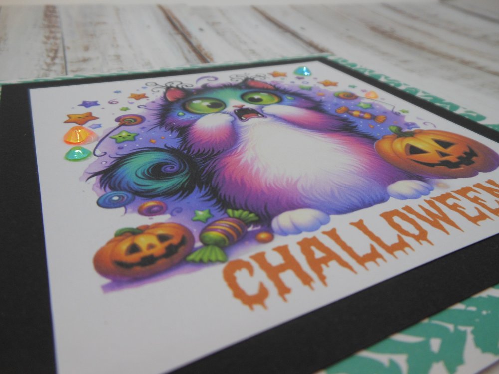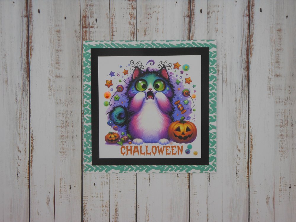 Carte chat multicolore halloween horrifié, fond noir et vert fait main