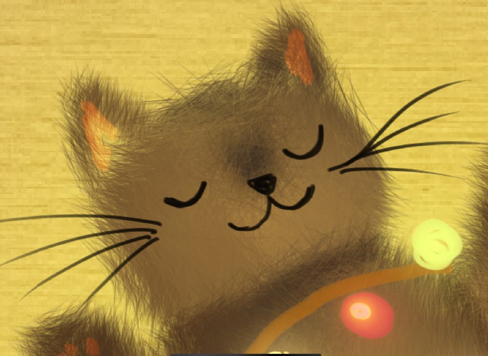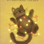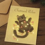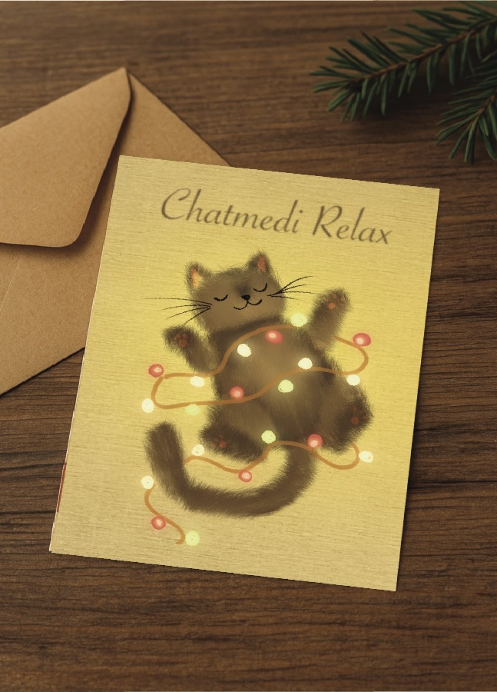 Un petit chat apaisé, tout moelleux, installé dans une guirlande lumineuse de Noël : un visuel tendre, drôle et réconfortant à afficher toute l'année.