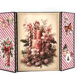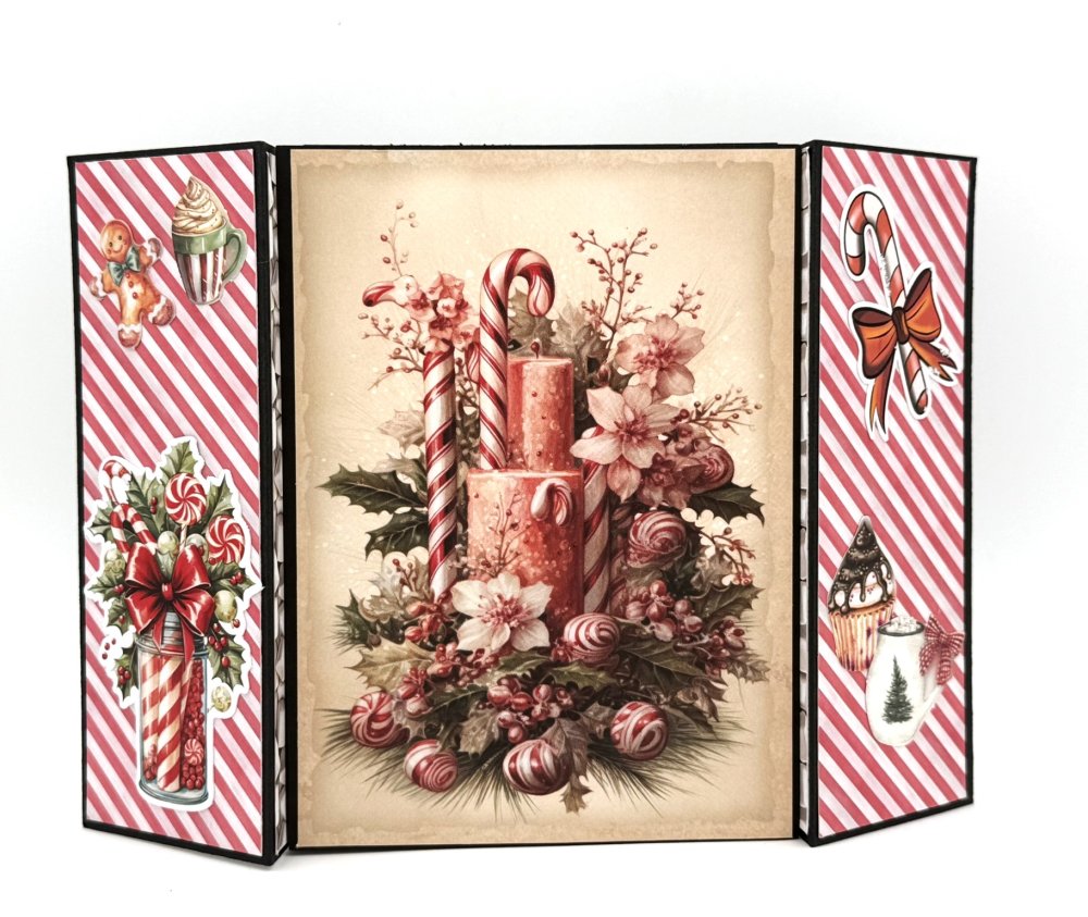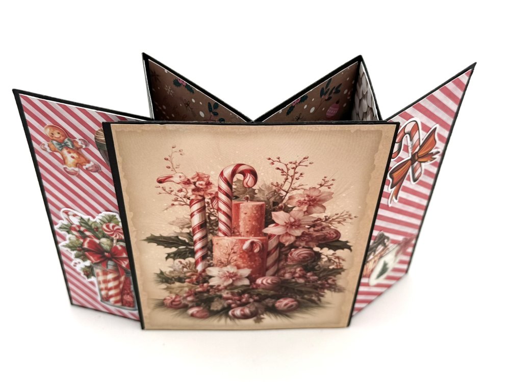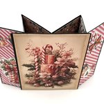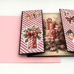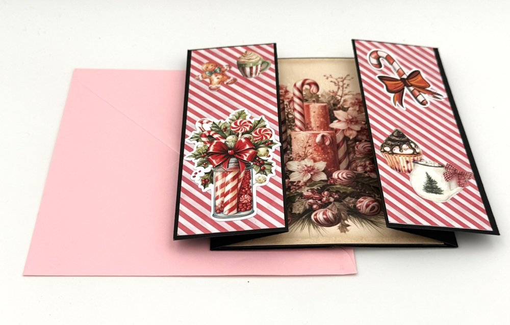 CARTE de NOEL avec pop-up s'ouvrant sur l'image d'une présentation de fleurs, bougies et canne en sucre dans les tons roses. Cette carte sur fond noir est accompagnée d'une enveloppe assortie.
