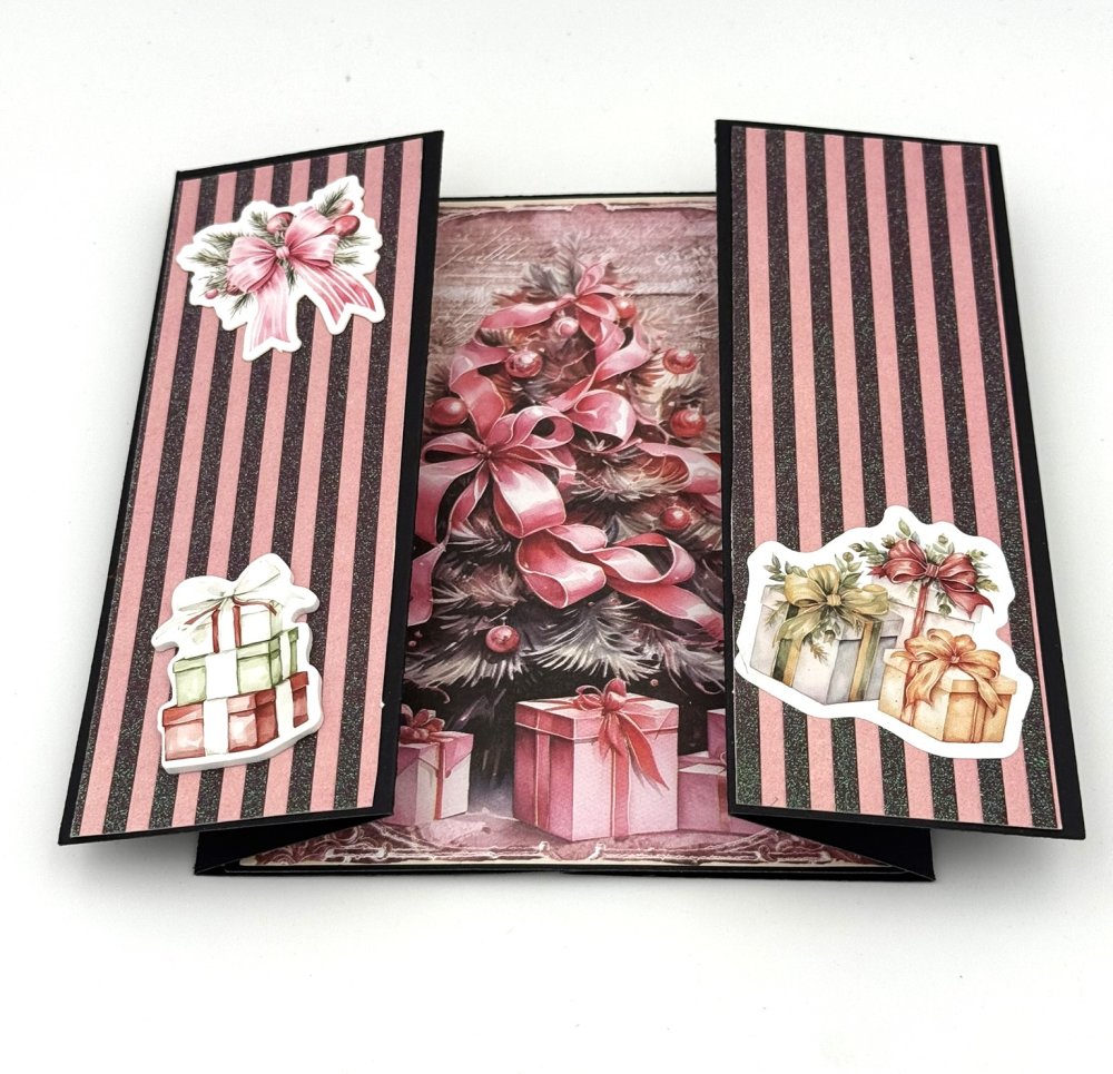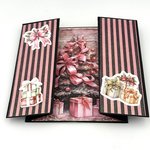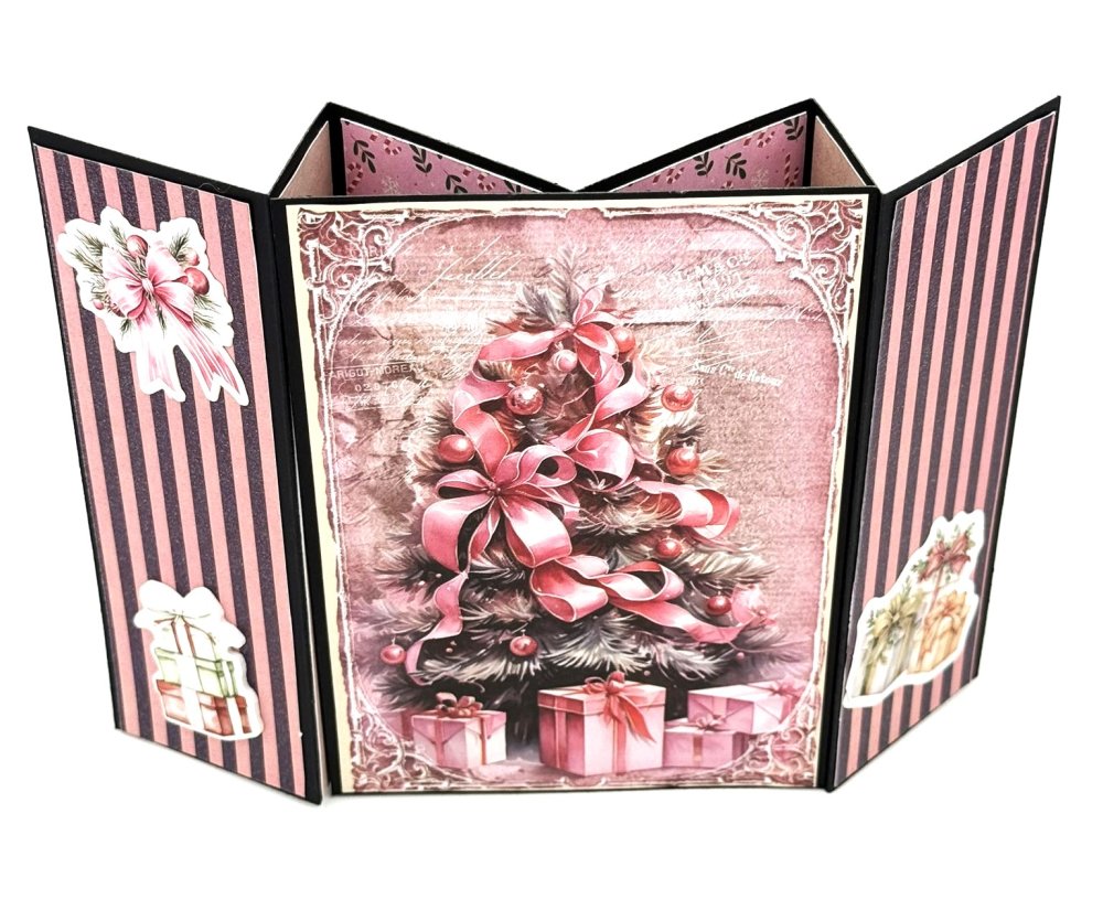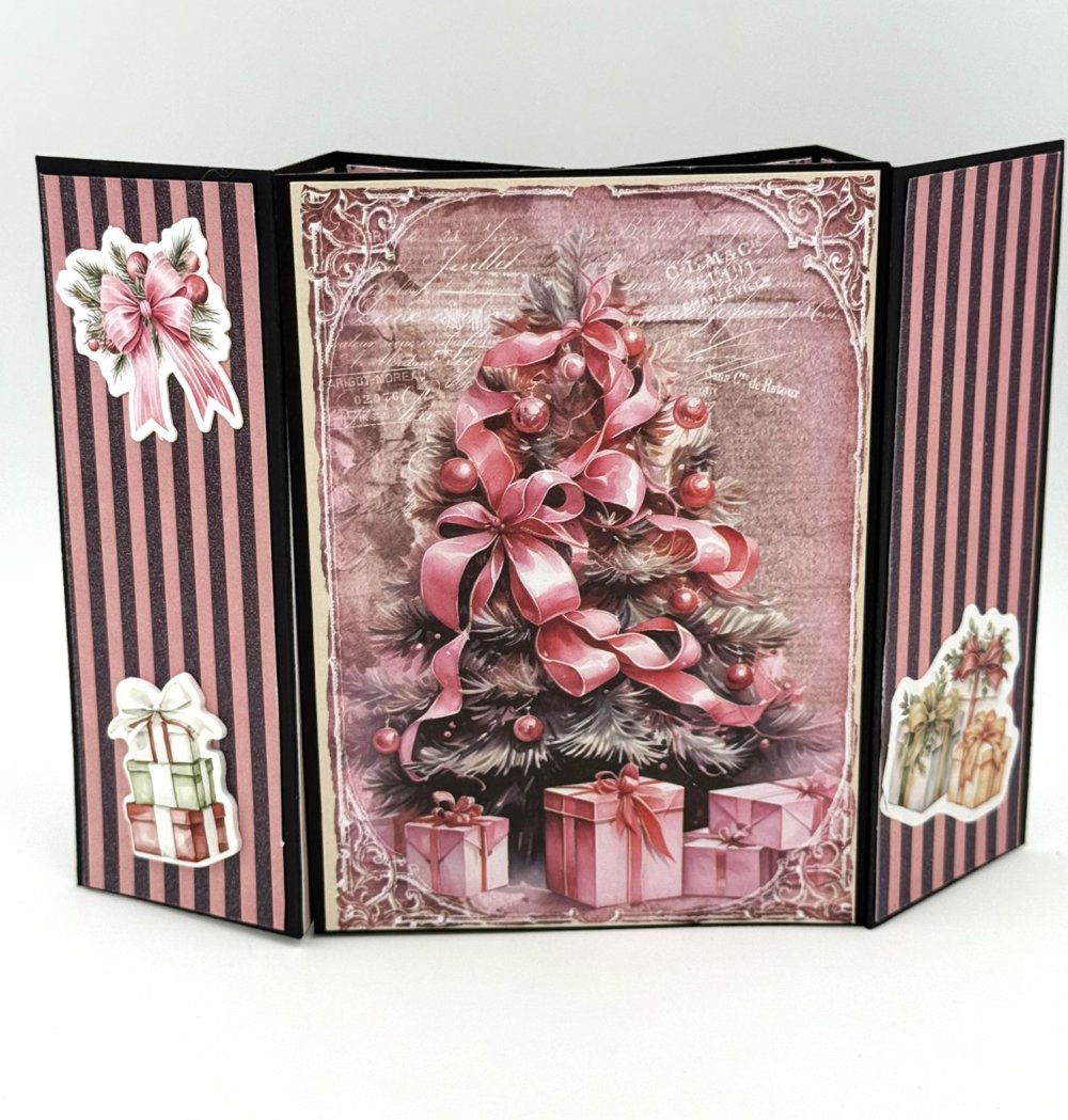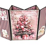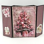 Le tableau central présente un sapin décoré de boules et noeuds roses et avec à son pied des cadeaux roses. Les deux côtés sont revêtus d'un papier décor ligné rose et brun sur lesquels sont placés des décorations assorties.