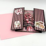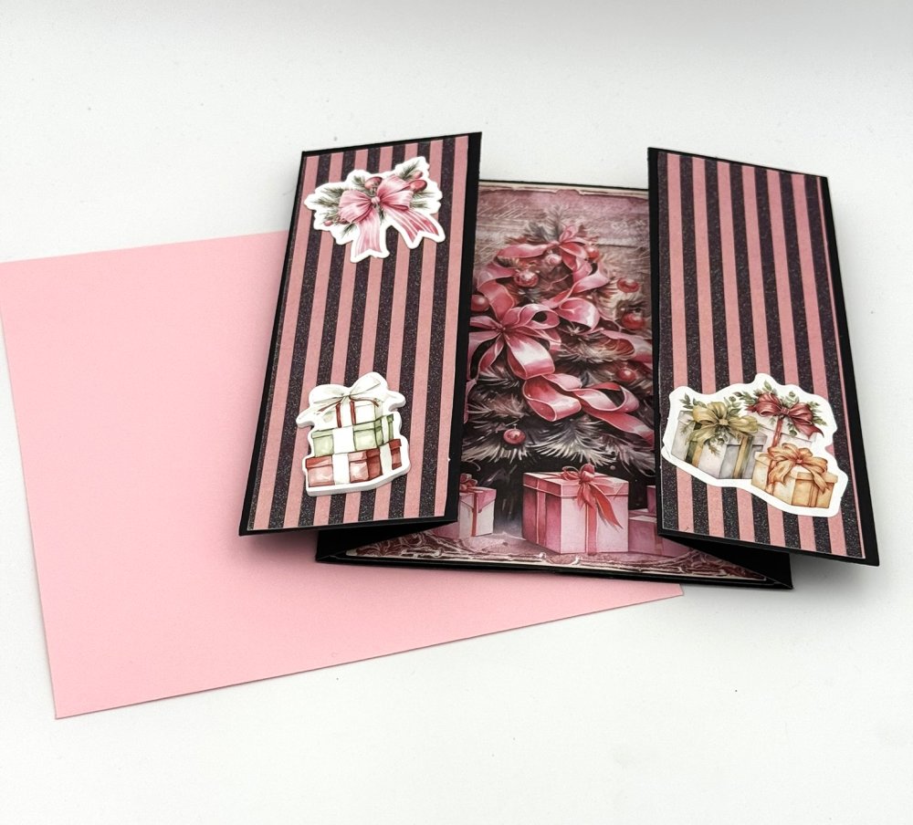 CARTE de NOEL avec pop-up formant un tableau avec un sapin décoré en rose et enveloppe assortie