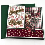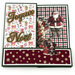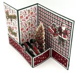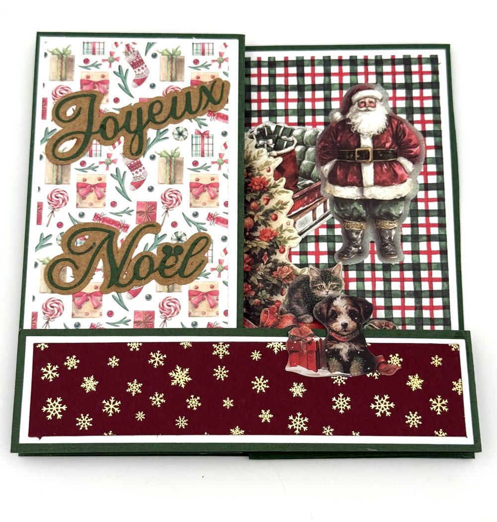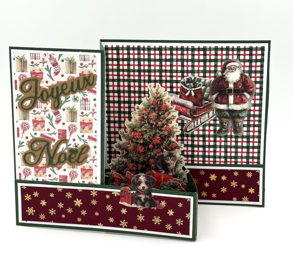 A l'ouverture de la carte apparaît un Père Noël et son traineau. Sur un escalier en pop-up, un sapin, des cadeaux, un chaton et un chiot sont disposés en relief.