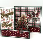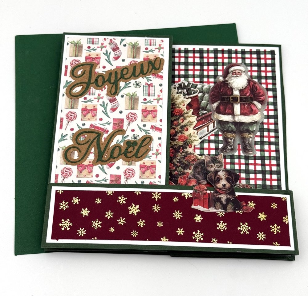 CARTE de NOEL DOUBLE sur fond vert avec pop-up sapin, cadeaux, chaton et chiot et son enveloppe assortie.