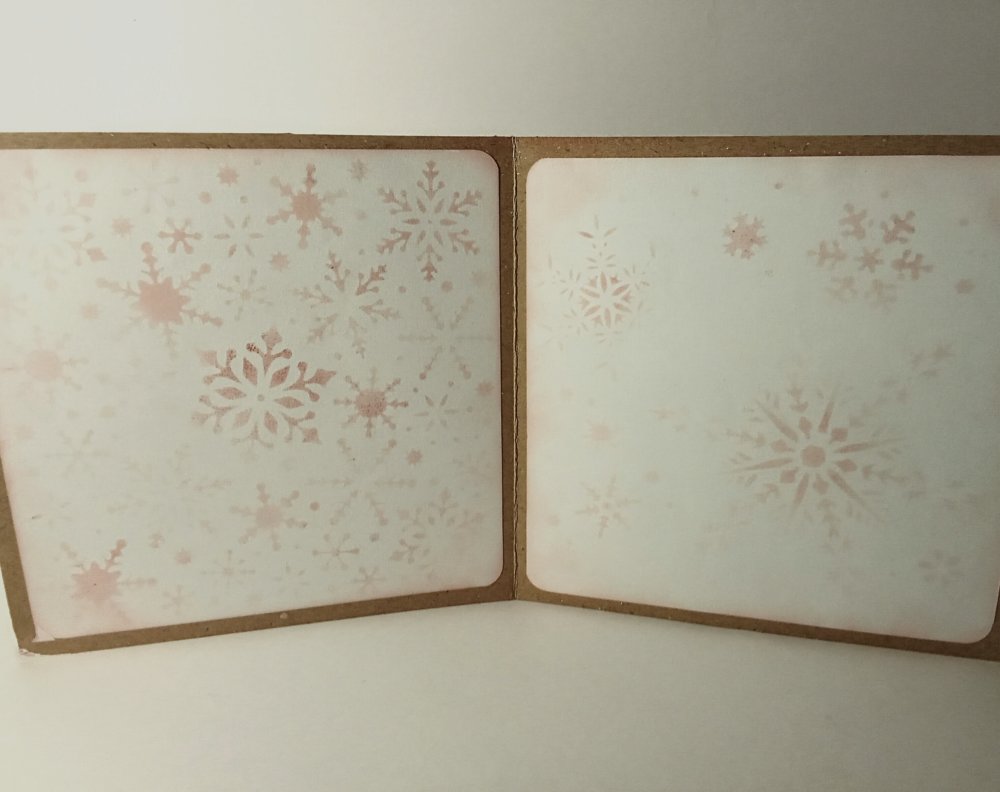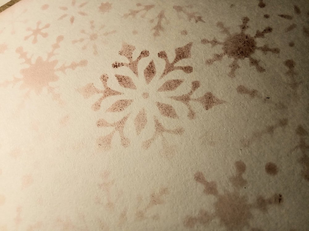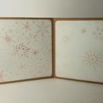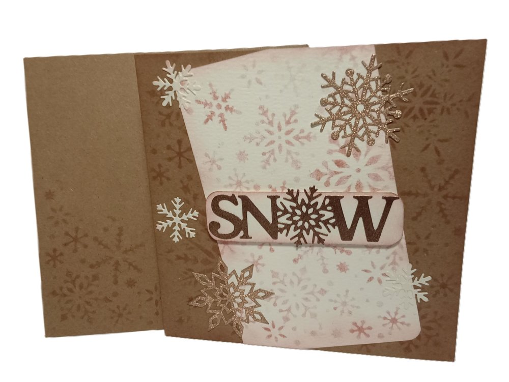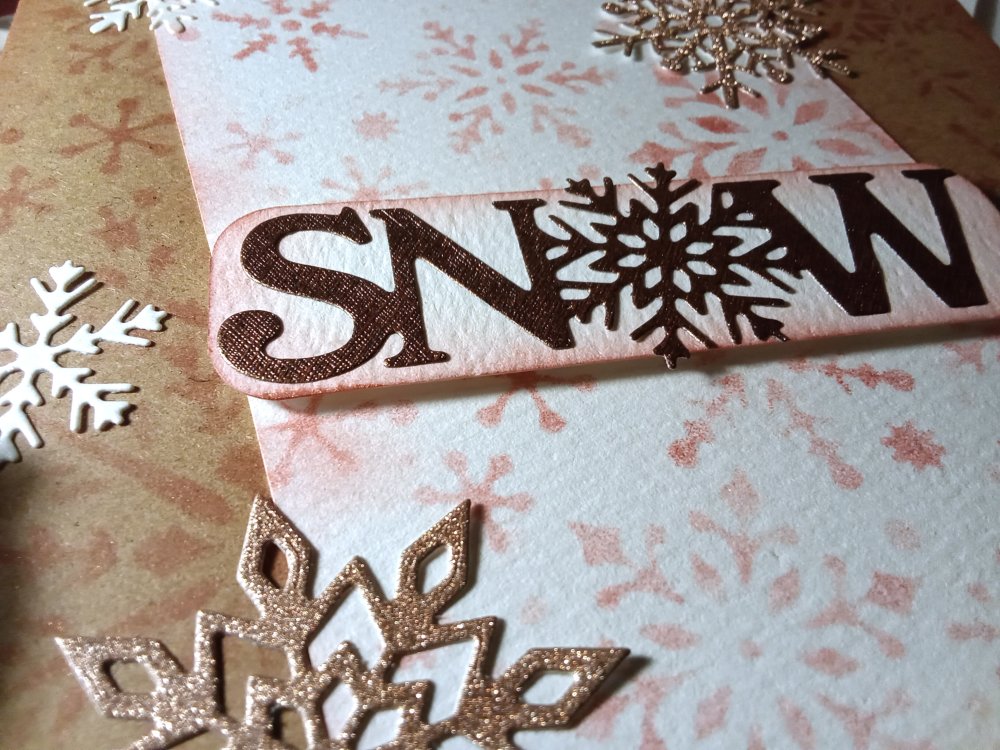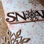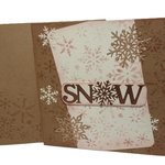 Base en papier cartonné kraft 250g, papier aquarelle blanc 250g, papier dessin 180g. Impression manuelle flocons à l'encre métallisée. En volume, inscription "Snow" (neige). Ombrage encre métalisée.