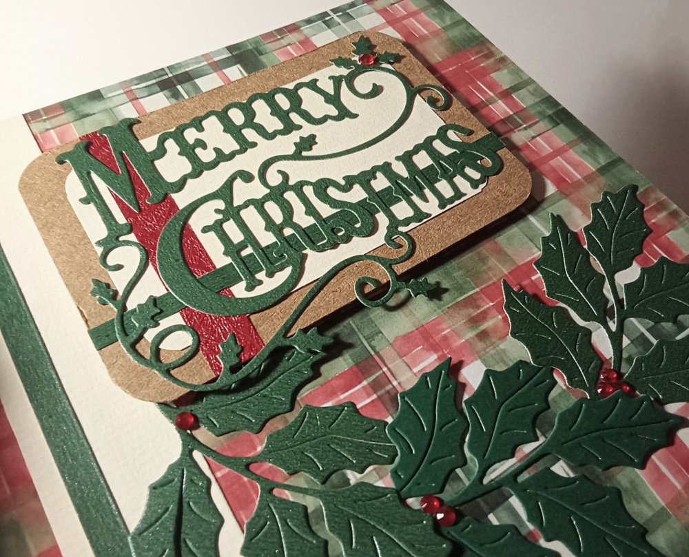 Encart message "Merry Christmas" en volume, carton kraft, papier cartonné vert nacré, papier rouge texturé et strass rouge pour les fruits du houx.