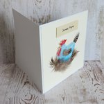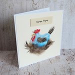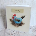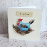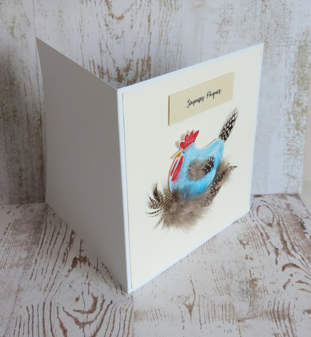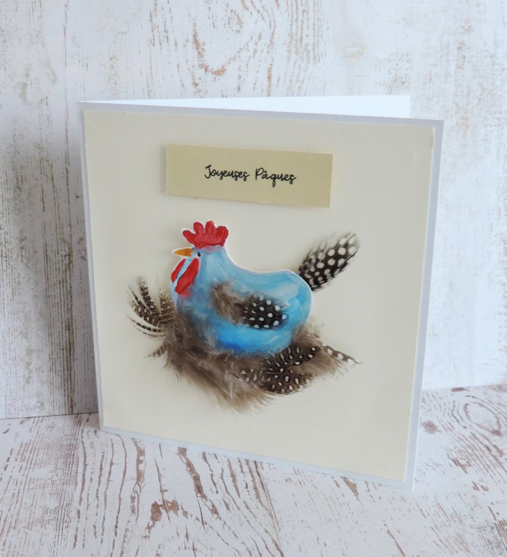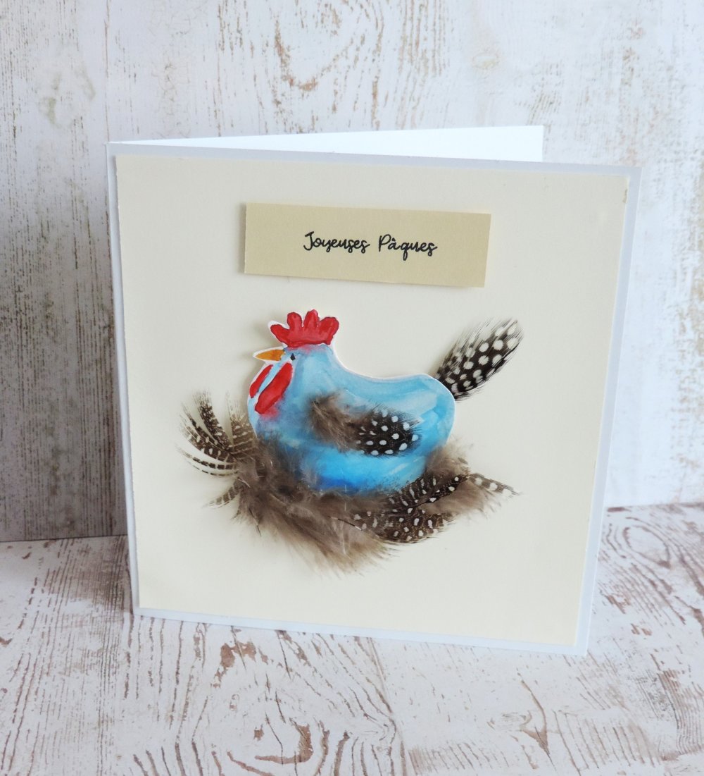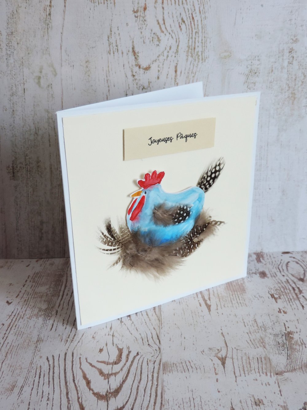 Carte originale et unique à offrir pour Pâques avec cette poulette bleue posée sur son nid de plumes.