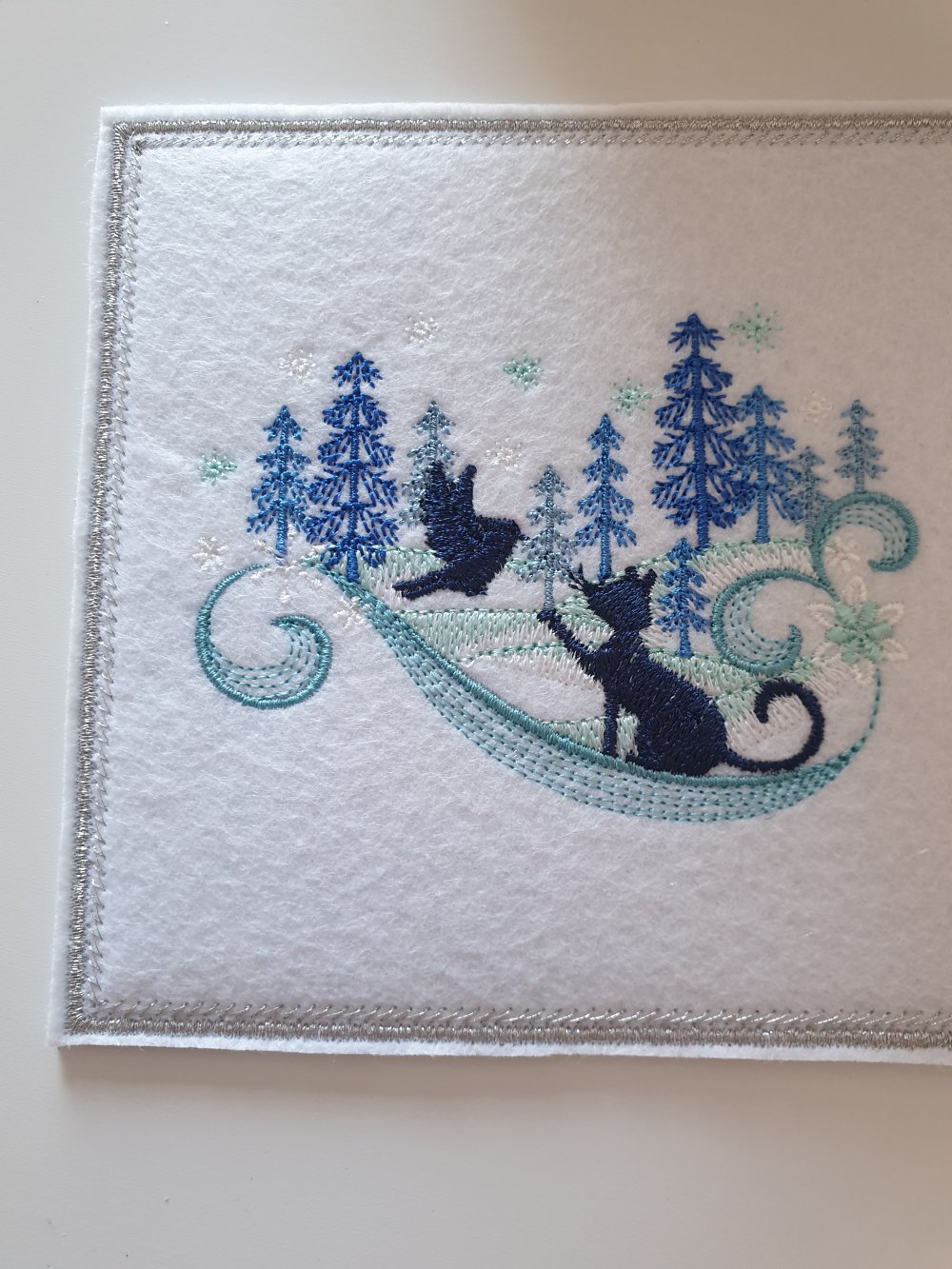 Carte de vœux en feutrine brodée – Modèle “Forêt enchantée & silhouettes câlines”