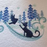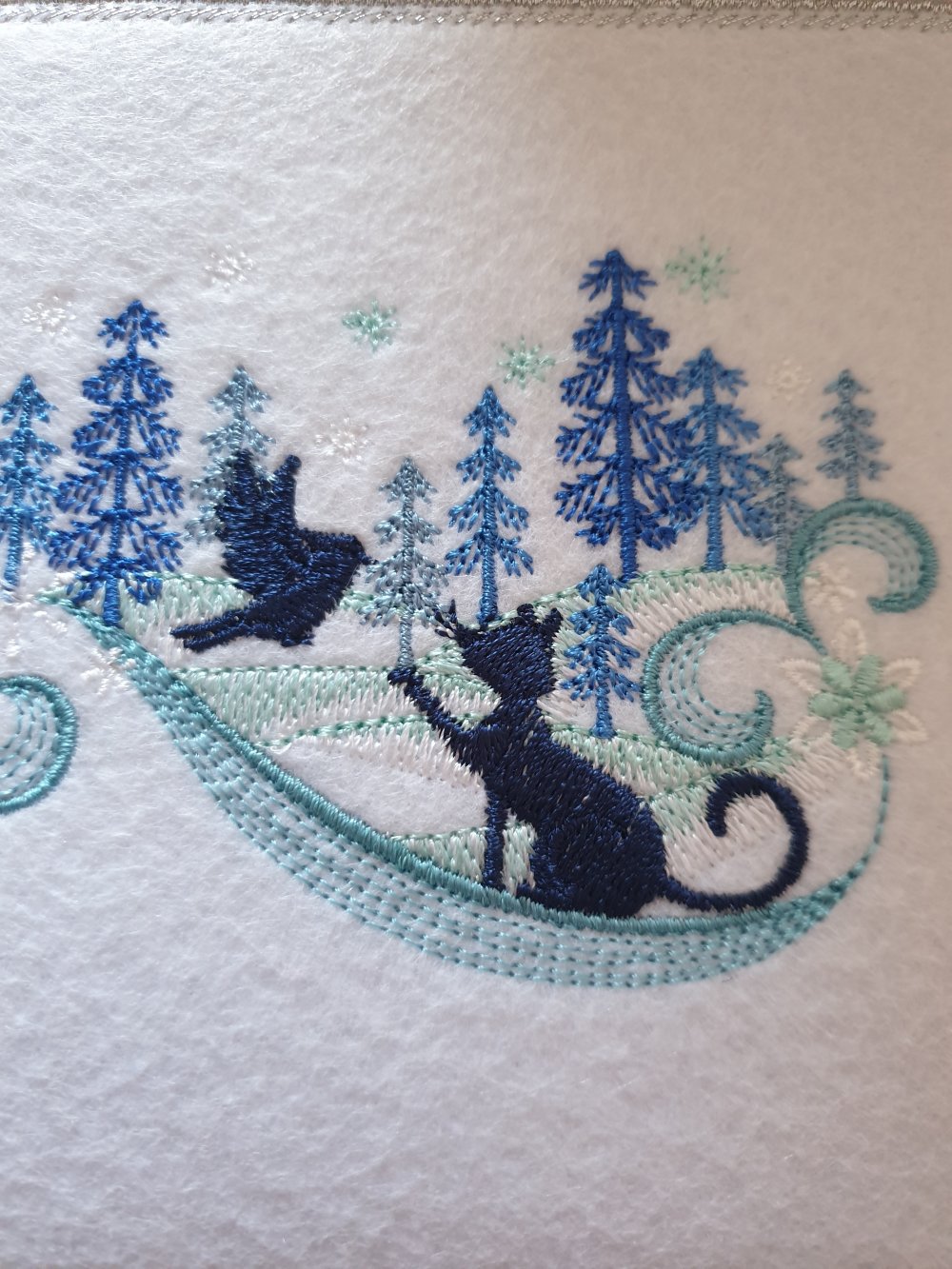 Offrez une touche de poésie hivernale avec cette carte de vœux unique réalisée sur une douce feutrine blanche. Chaque détail est minutieusement brodé : les sapins bleutés, les volutes élégantes et les petites étoiles scintillantes composent un décor féerique.