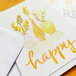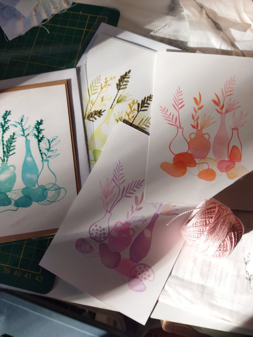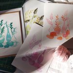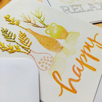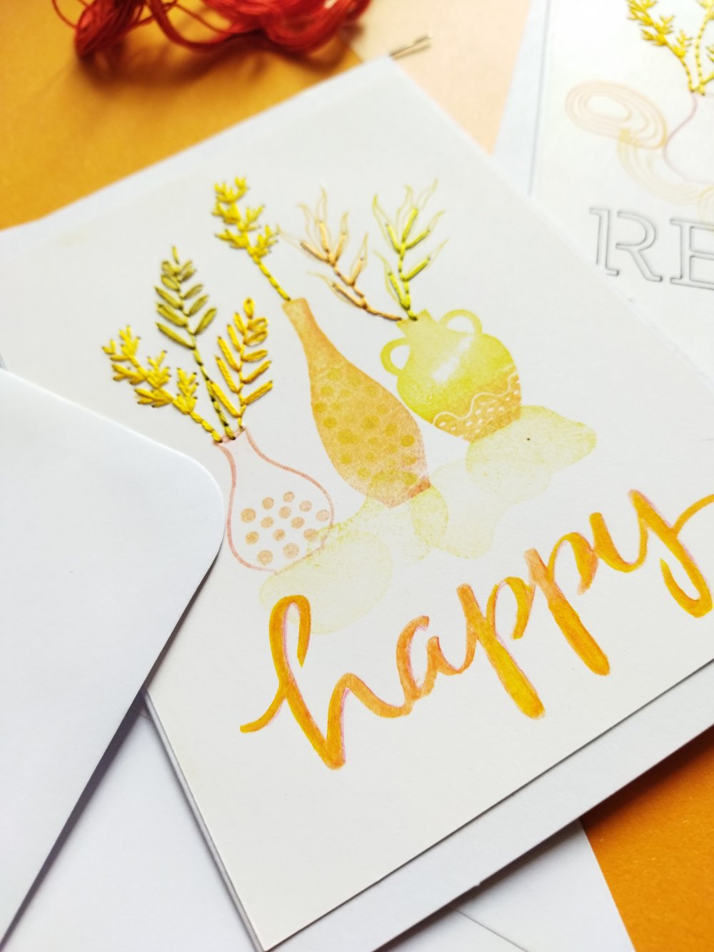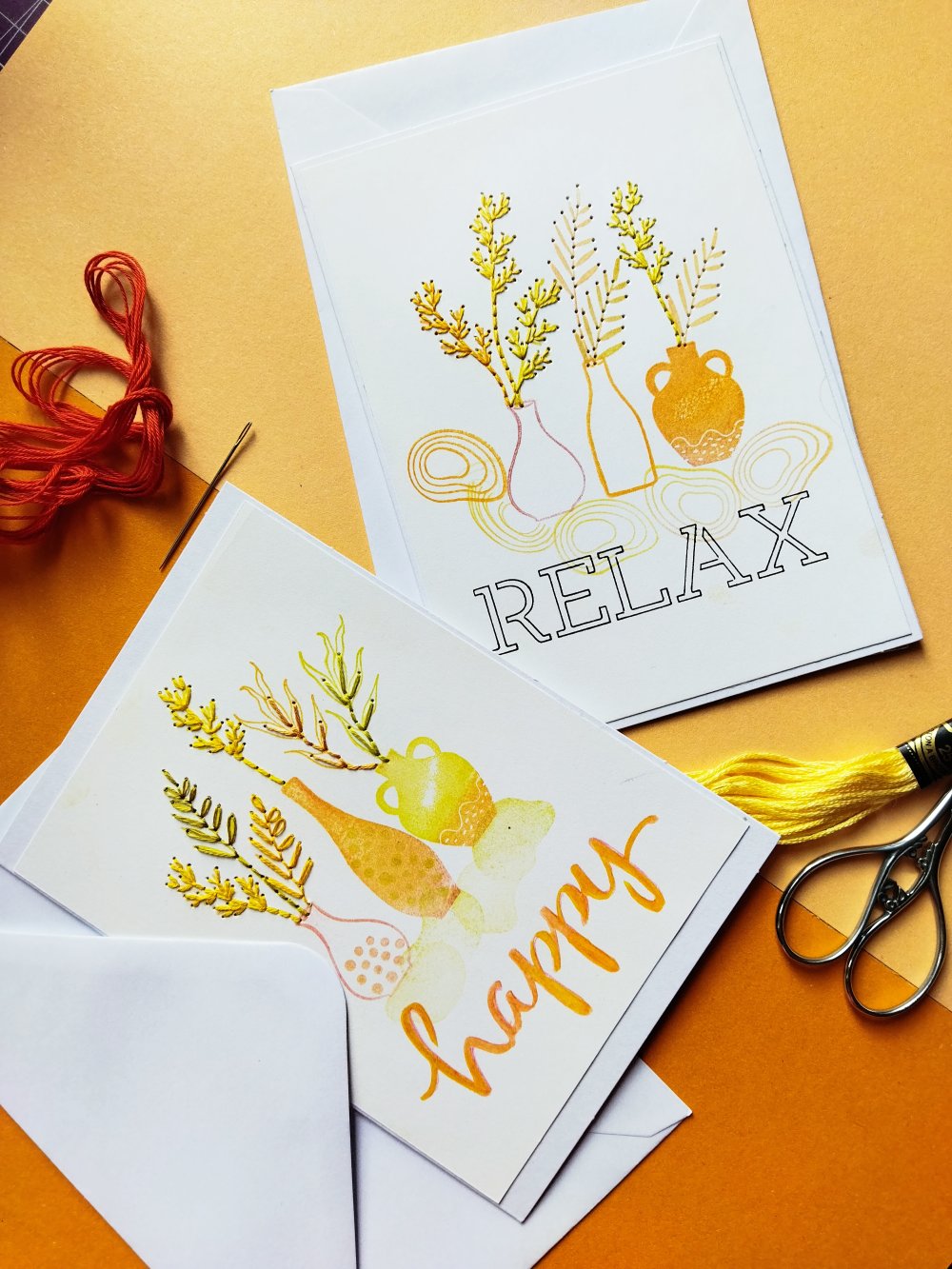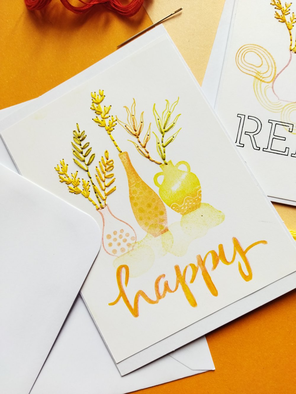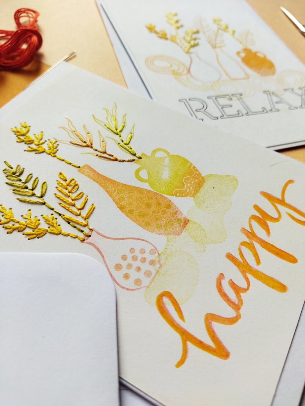 Déclinées dans un camaïeu de couleurs orangée, jaune, ces cartes de voeux sont rebrodées pour leur offrir plus de relief et en faire des pièces uniques.