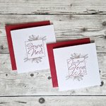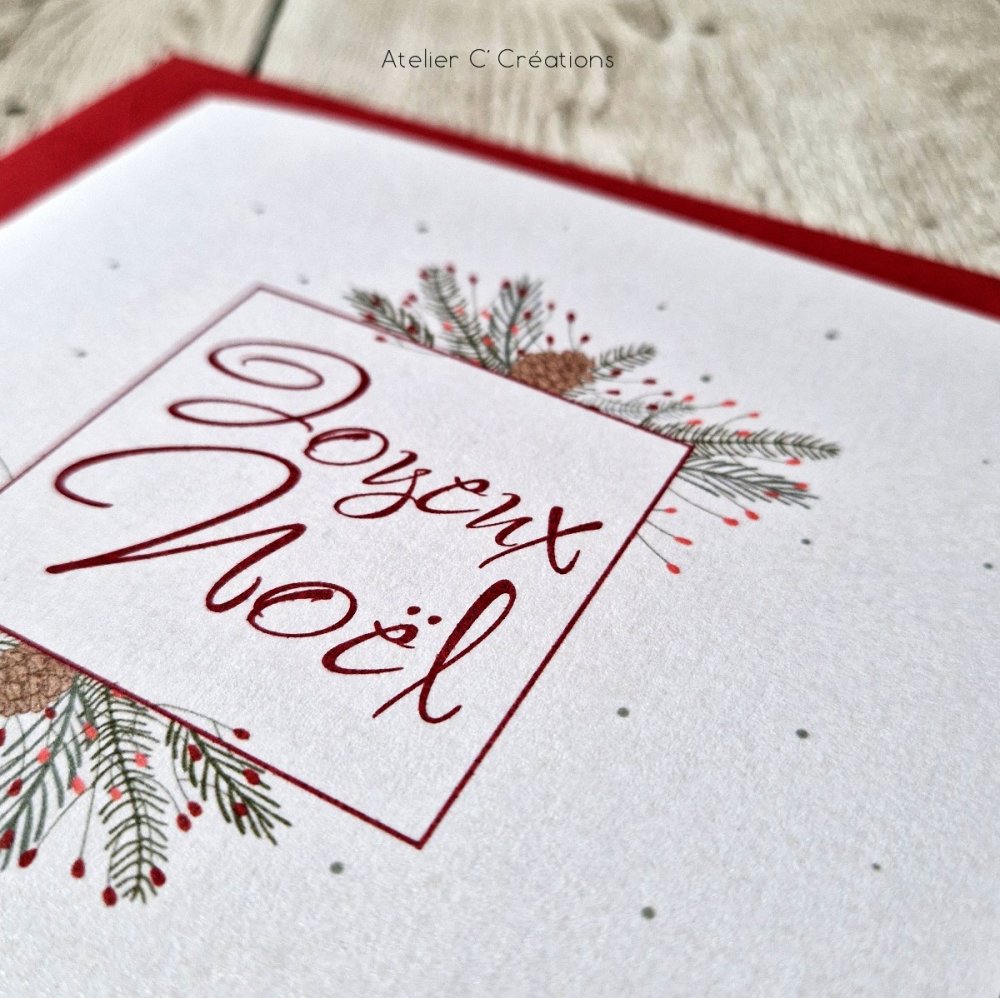 Carte pliée coloris blanc nacré, graphisme évoquant Noël; pommes de pin, branches de sapin