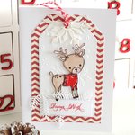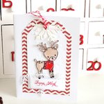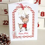 Carte double sur base cartonnée blanche, coloris rouge et blanc avec petit renne.