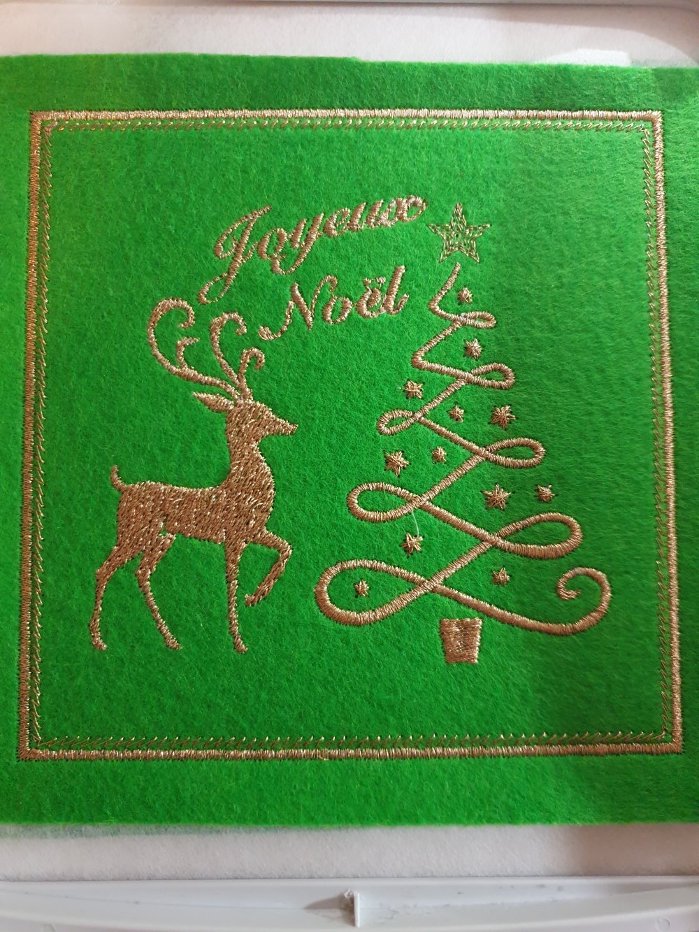 Carte en feutrine verte, brodée cerf et sapin en fil doré