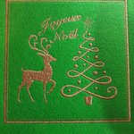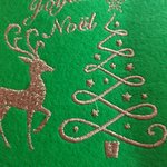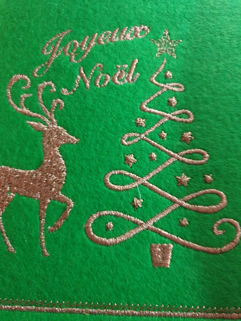 Le motif brodé en fil doré – renne élégant, sapin stylisé et inscription « Joyeux Noël » – apporte une touche festive et raffinée.