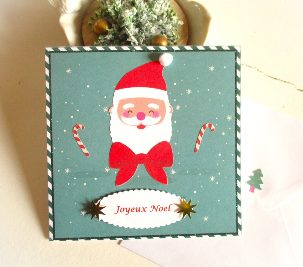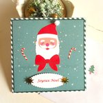 Fond de carte blanc, décor vert, Père Noel, étiquette Joyeux Noel.