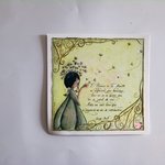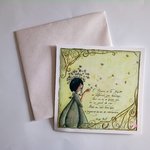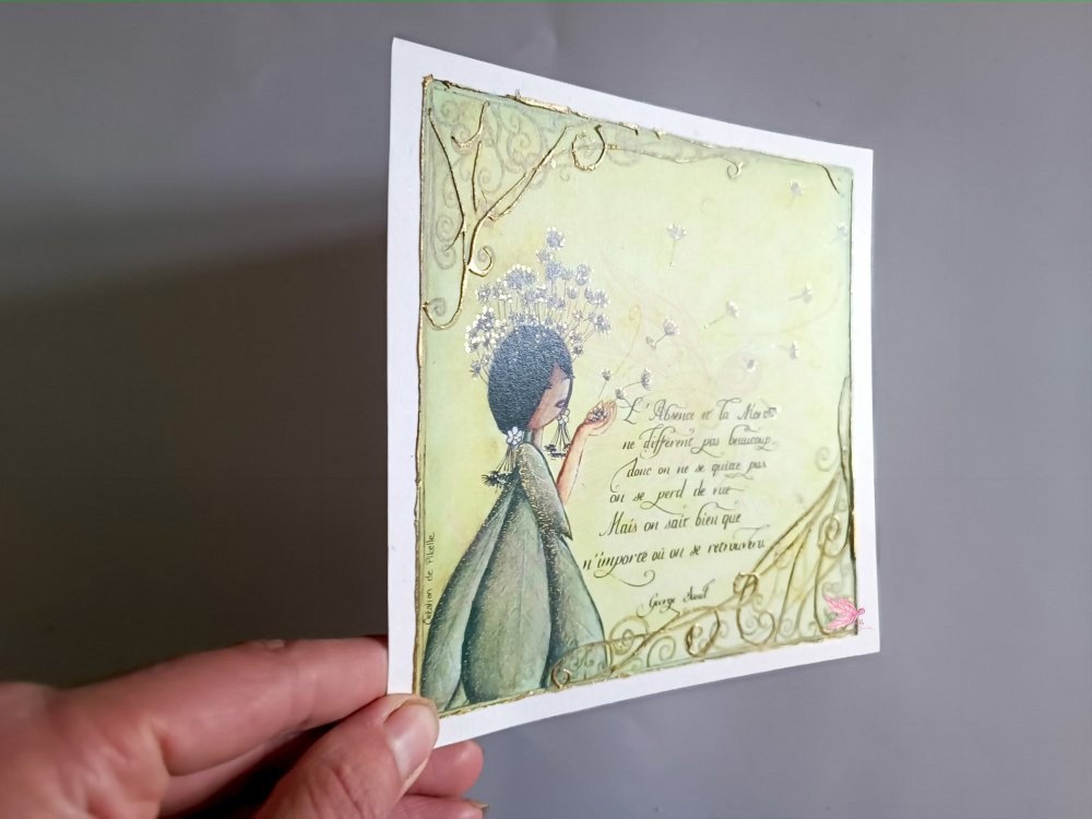 Carte féérique Joyeux Anniversaire, petit fée pissenlit, dorée en relief à la main