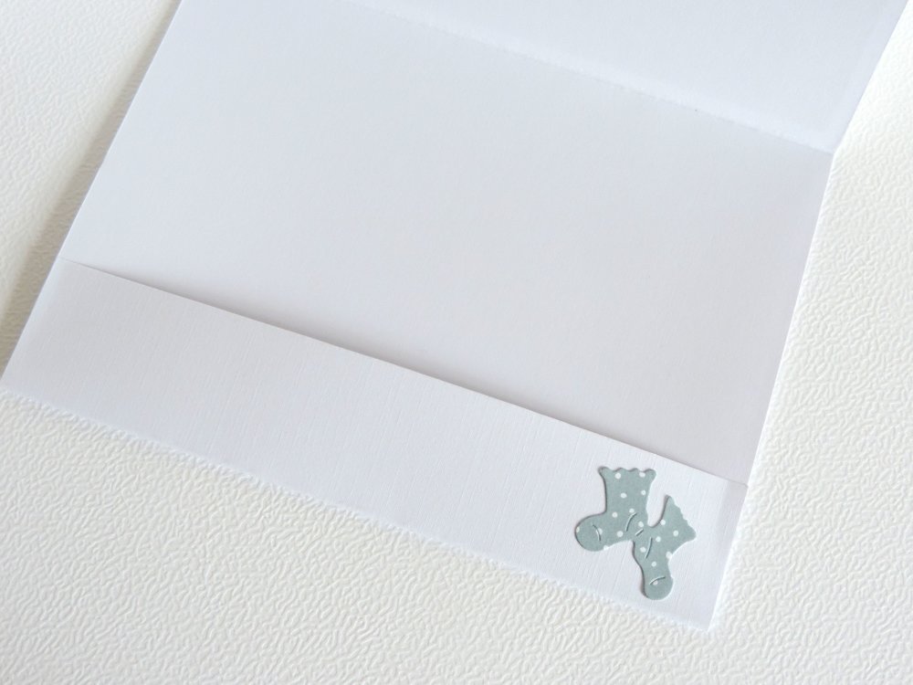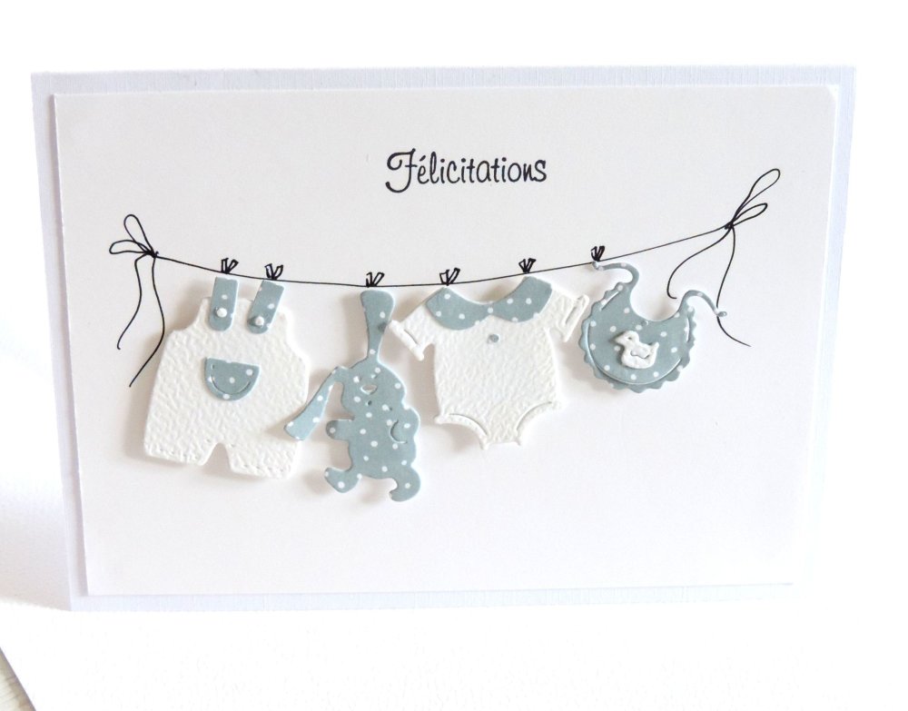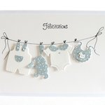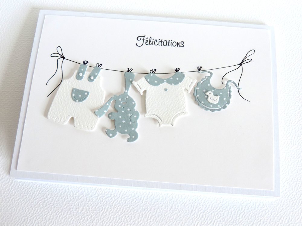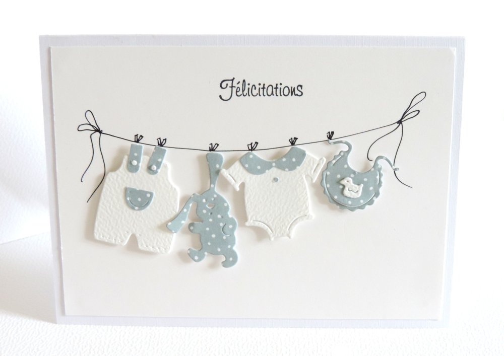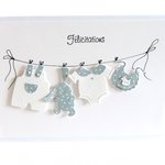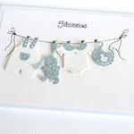 Carte de félicitations pour la naissance d'un bébé garçon, coloris bleu-gris et blanc, faite main.