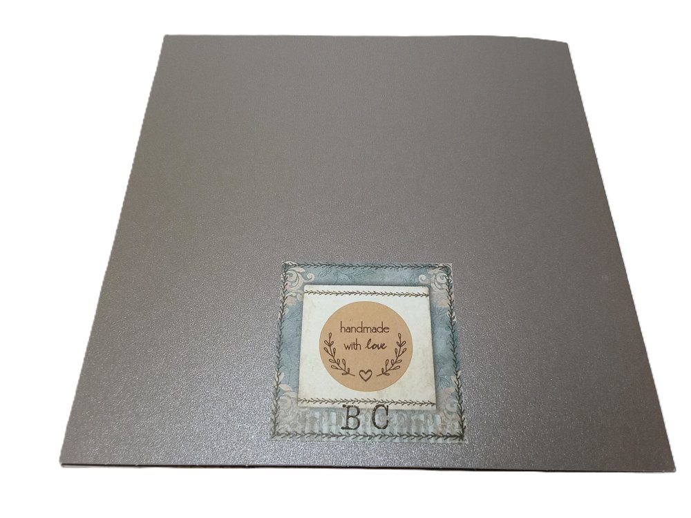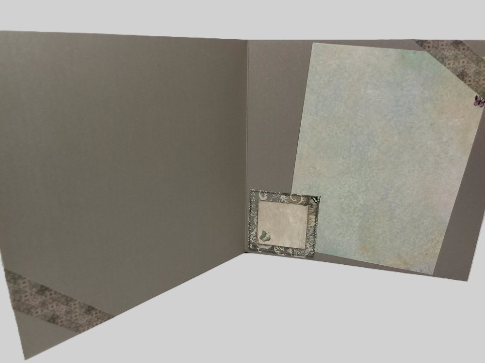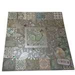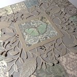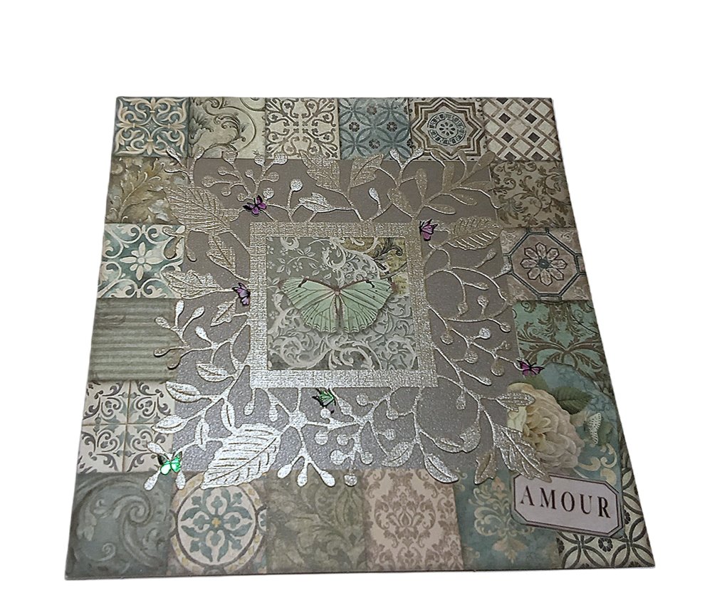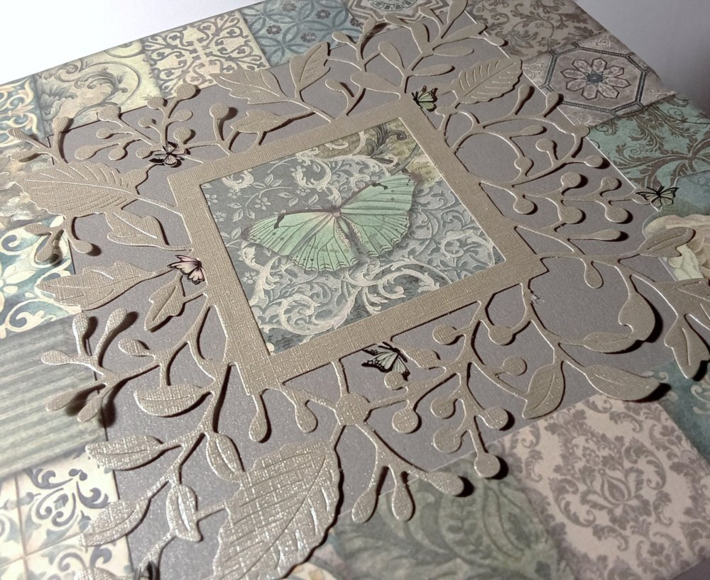 Papier cartonné 240g métallisé irisé gris argenté, cadre feuillage en papier métallisé texturé argenté, et papier impression carreaux vieilli bleu/vert.