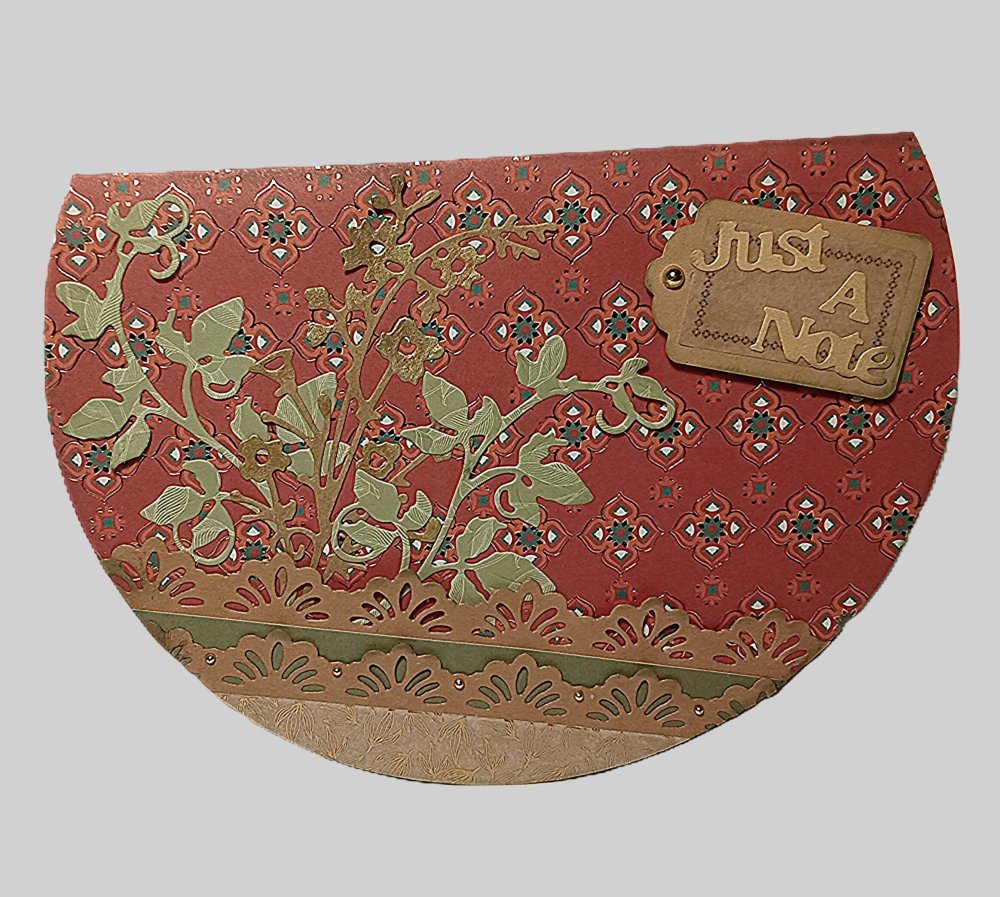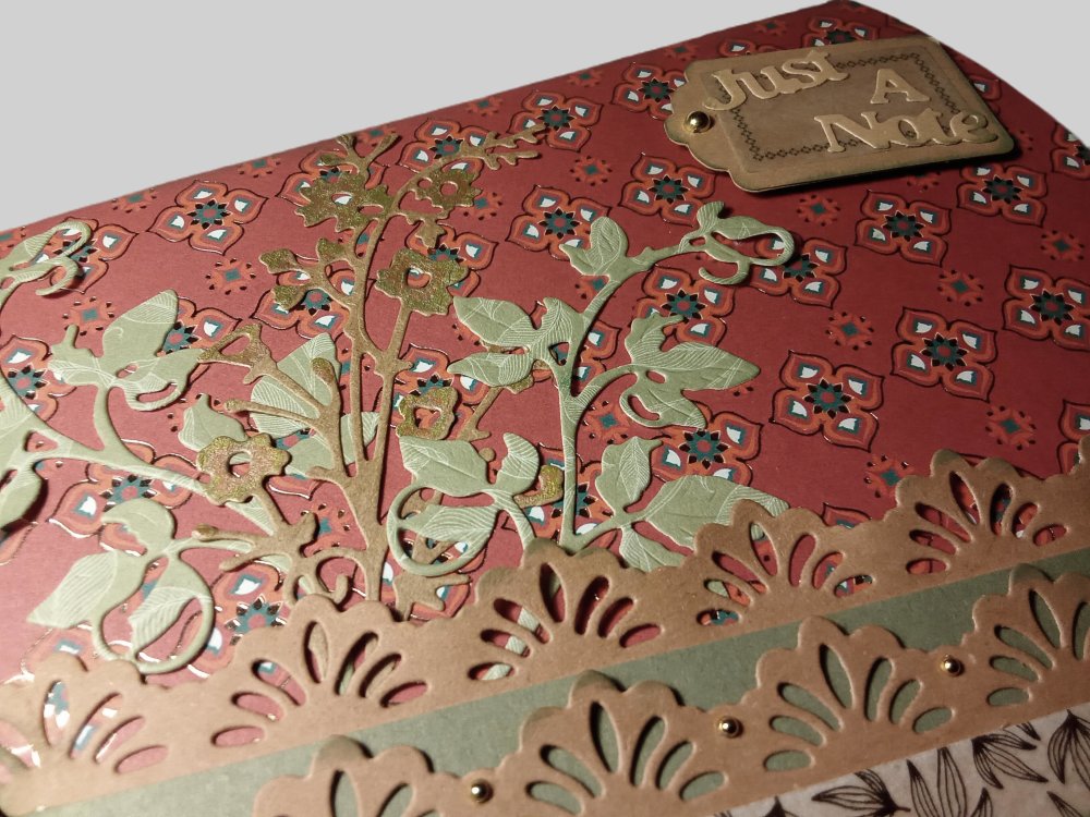 Étiquette "Just a Note" (juste un mot/message) en volume 3D et quelques petits clous dorés. Encart méssage à l'interieur.