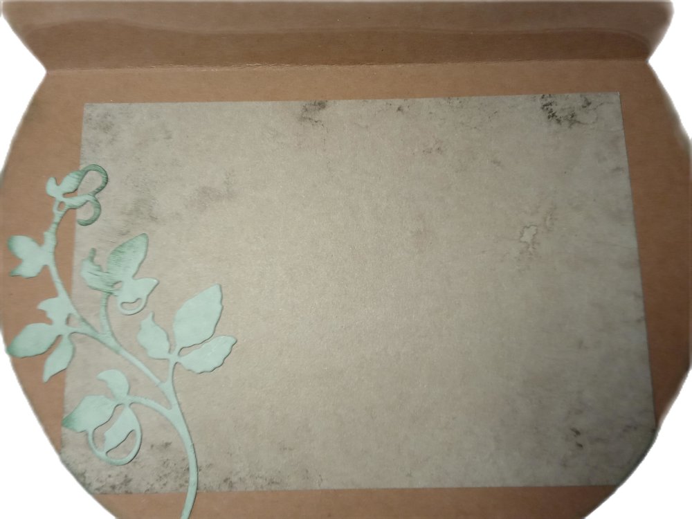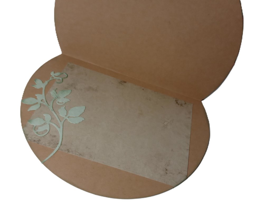 Carte fait main papier cartonné kraft 250g, papier sérigraphié terracotta et doré. Feuillage kraft et vert pâle. Feston kraft et masking tape.