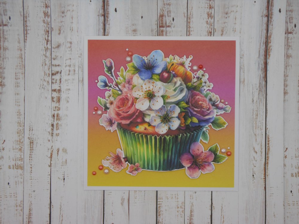 Carte toute occasion 15 x 15 cupcake fleuri fond bleu jaune rose mauve fait main Ajout au panier