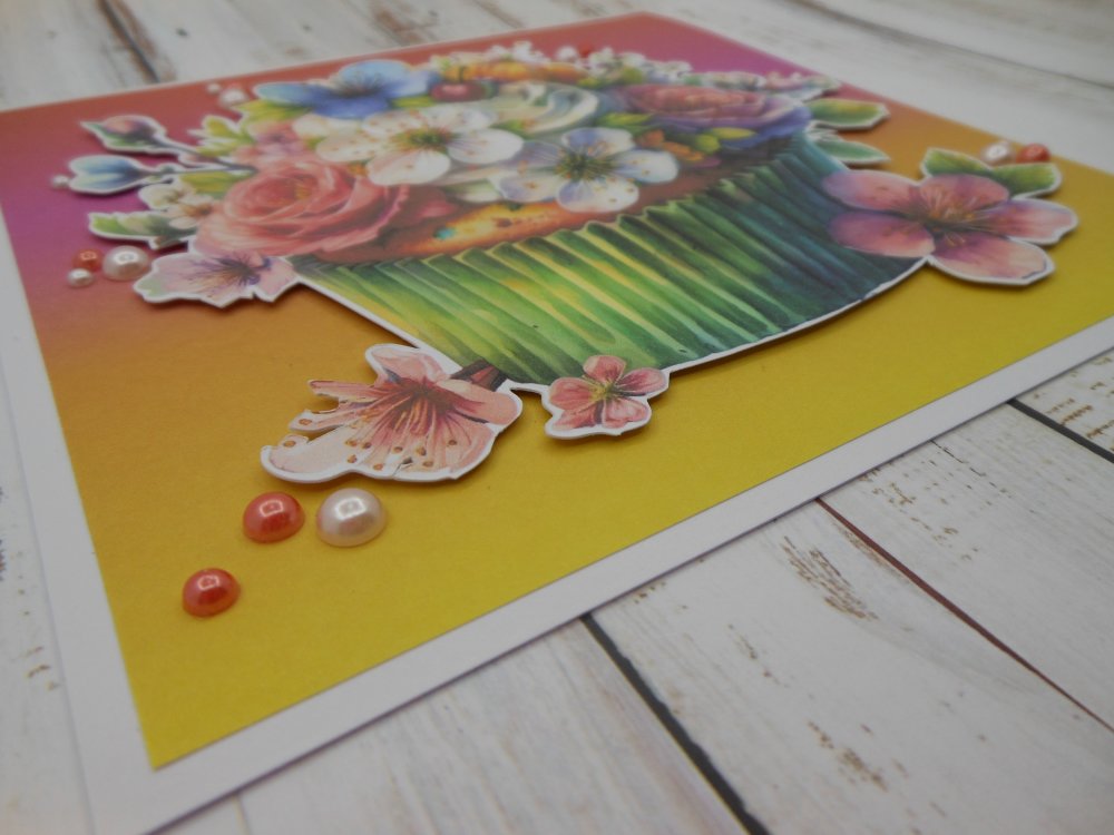 Carte toute occasion 15 x 15 cupcake fleuri fond corail rose orange jaune fait main
