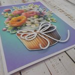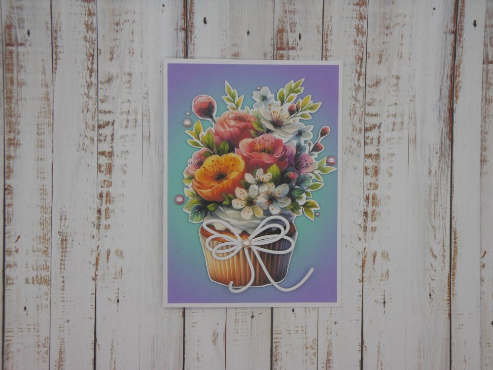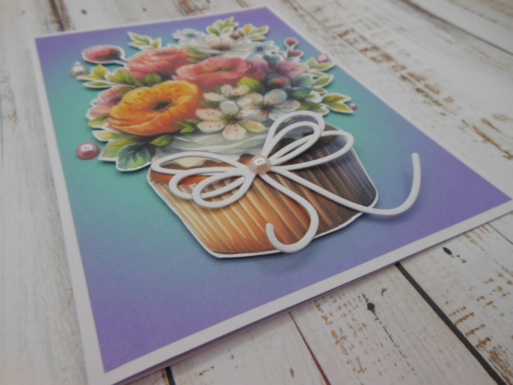 Cette carte double est entièrement réalisée avec des papiers cartonnés. Sur le fond en dégradé de couleurs, le gâteau est monté sur mousse 3d pour plus de volume, quelques perles rehaussent la scène.