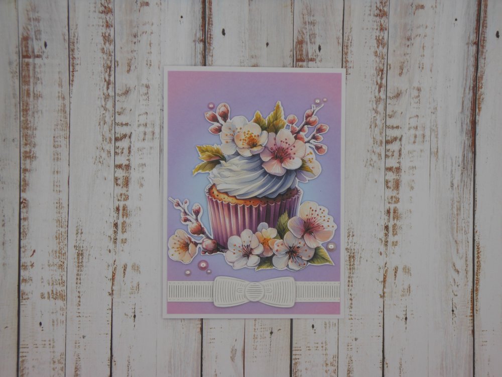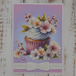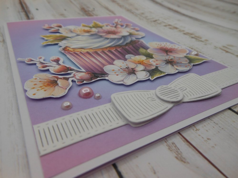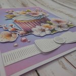 Cette carte double est entièrement réalisée avec des papiers cartonnés. Sur le fond en dégradé de couleurs, le gâteau est monté sur mousse 3d pour plus de volume, quelques perles rehaussent la scène.