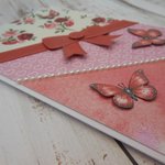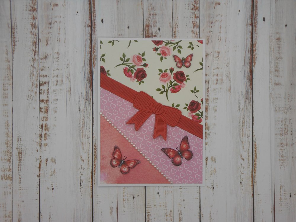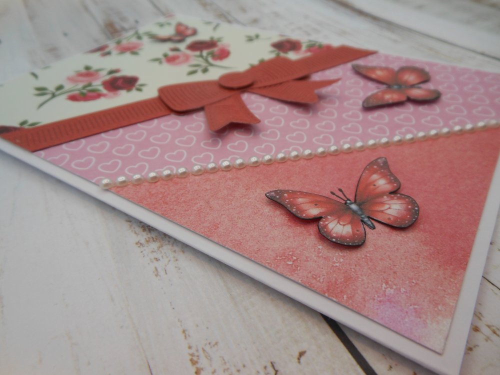 Carte toute occasion tons de rose rouge coeurs, roses papillons noeud et perles fait main
