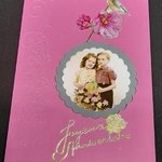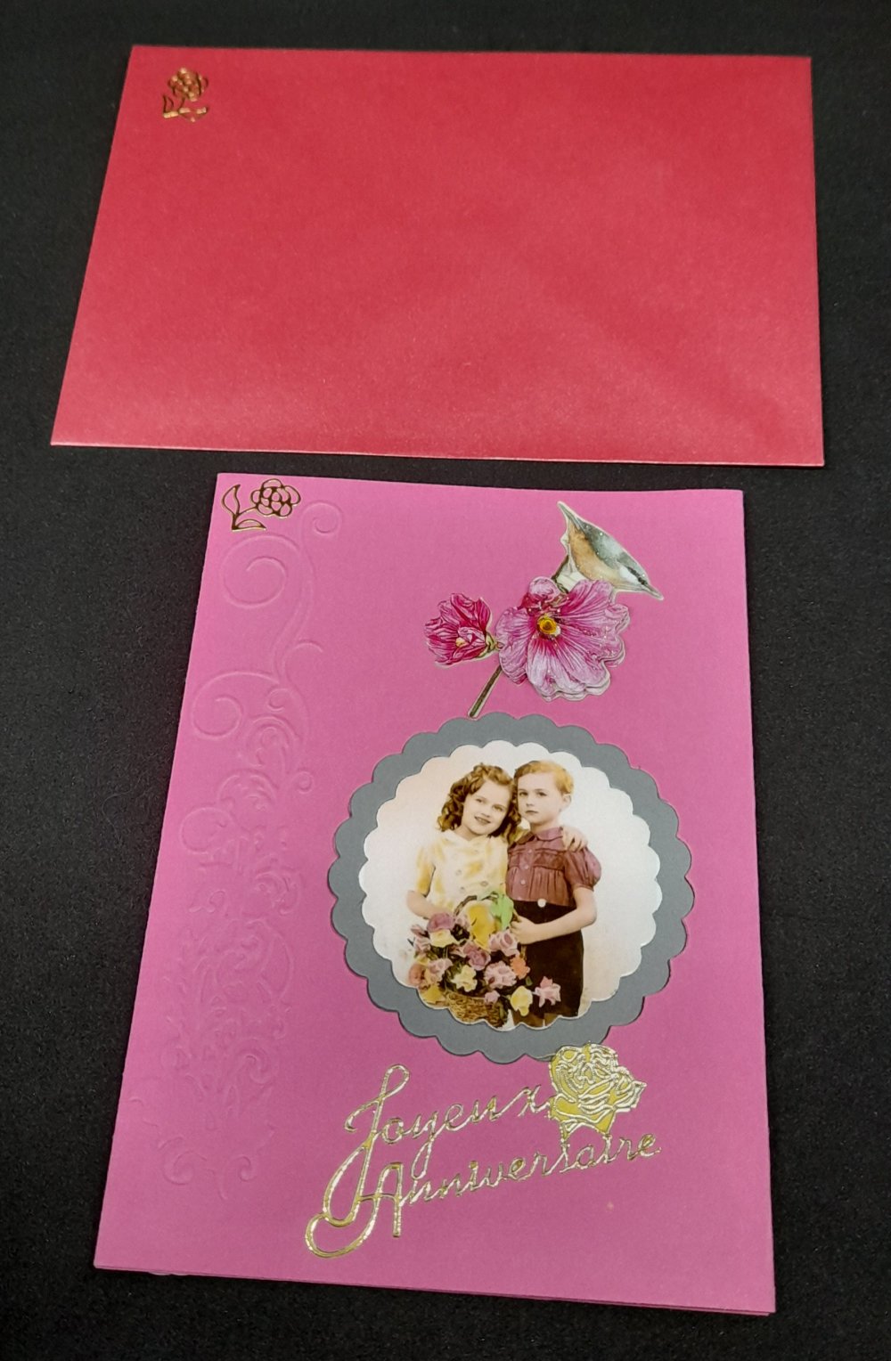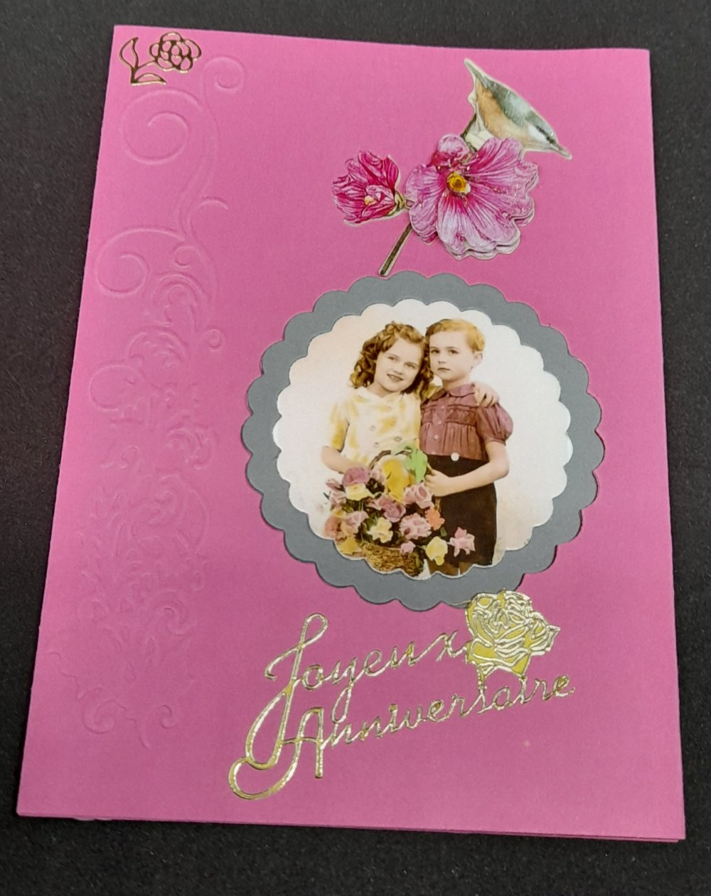 Offrez un instant de poésie avec cette carte d'anniversaire réalisée à la main. Sur un fond rose délicatement décoré se trouve deux jeunes enfants. Les petites sujets ajoutent de la douceur, créant une scène chaleureuse.