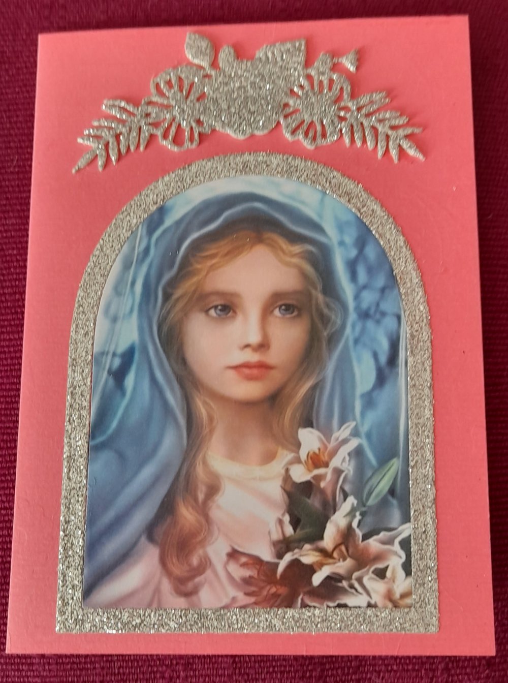 Offrez un instant de poésie avec cette carte de noël réalisée à la main. Sur un fond rose délicatement décoré se trouve une jeune femme. Les petites sujets ajoutent de la douceur, créant une scène chaleureuse.