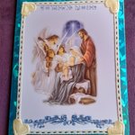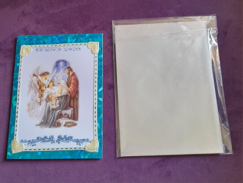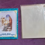 Offrez un instant de poésie avec cette carte de noël réalisée à la main. Sur un fond bleu délicatement décoré se trouve une scène de la natalité. Les petites sujets ajoutent de la douceur, créant une scène chaleureuse.