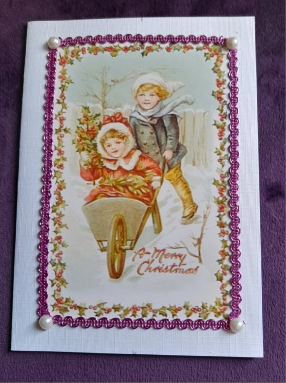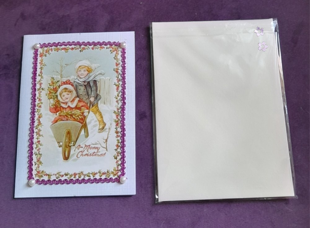 Offrez un instant de poésie avec cette carte de noël réalisée à la main. Sur un fond blanc délicatement décoré se trouve deux enfants jouant dans la neige. Les petites sujets ajoutent de la douceur, créant une scène chaleureuse.