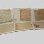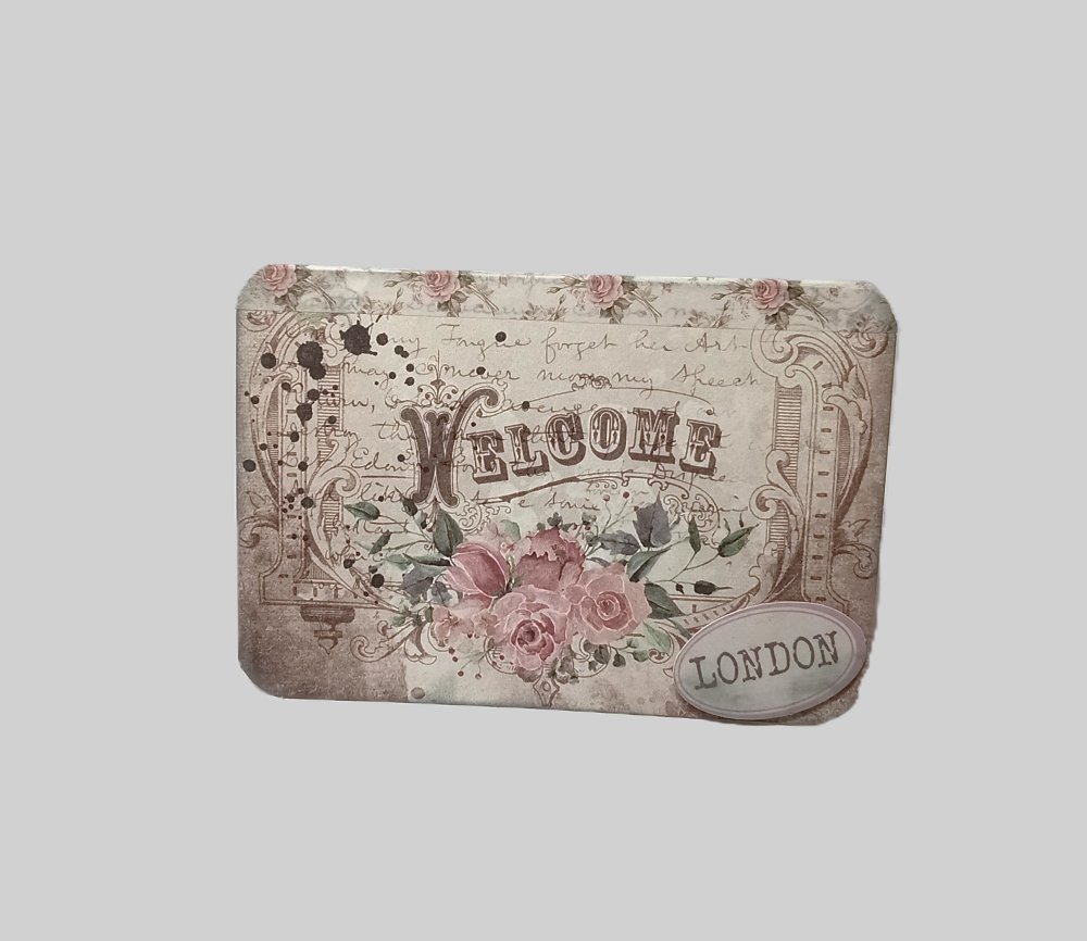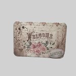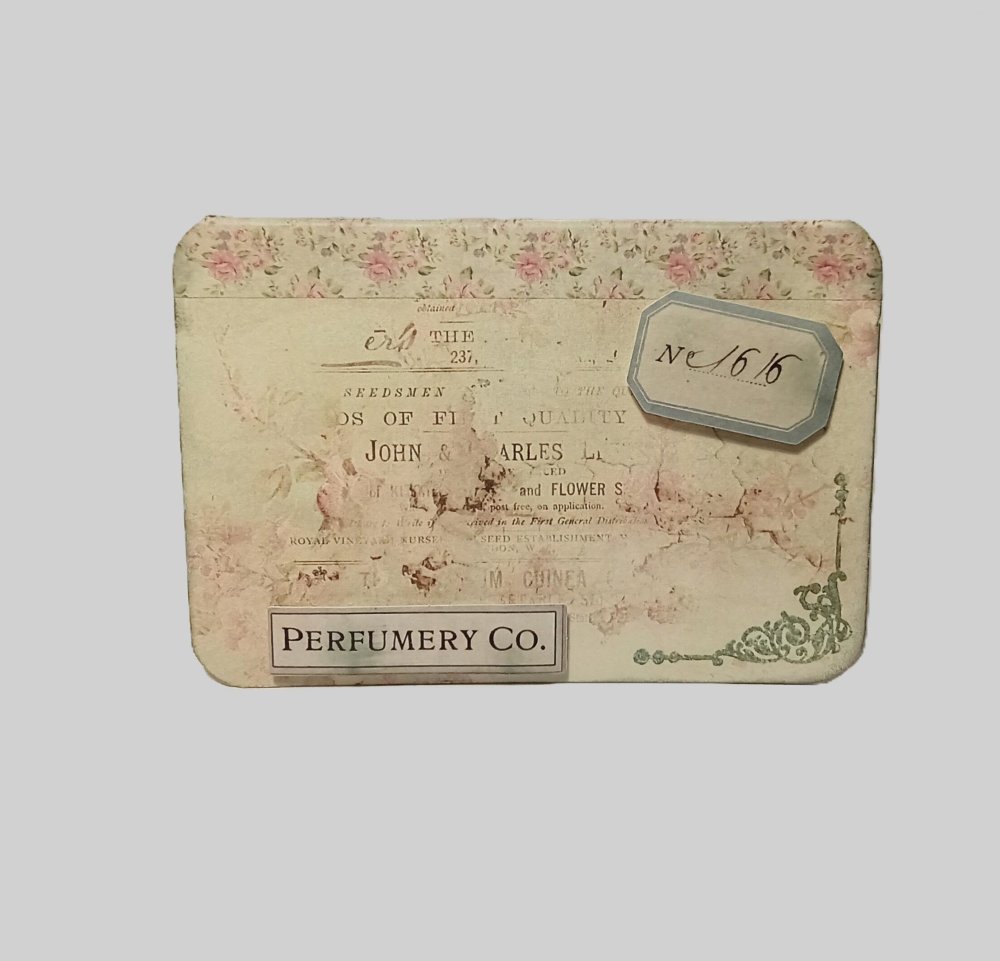 Base en carton glacé blanc agrémenté de différents papiers fleuris et textes anciens. Ombrage à l'encre. Éléments décoratifs en 3D.