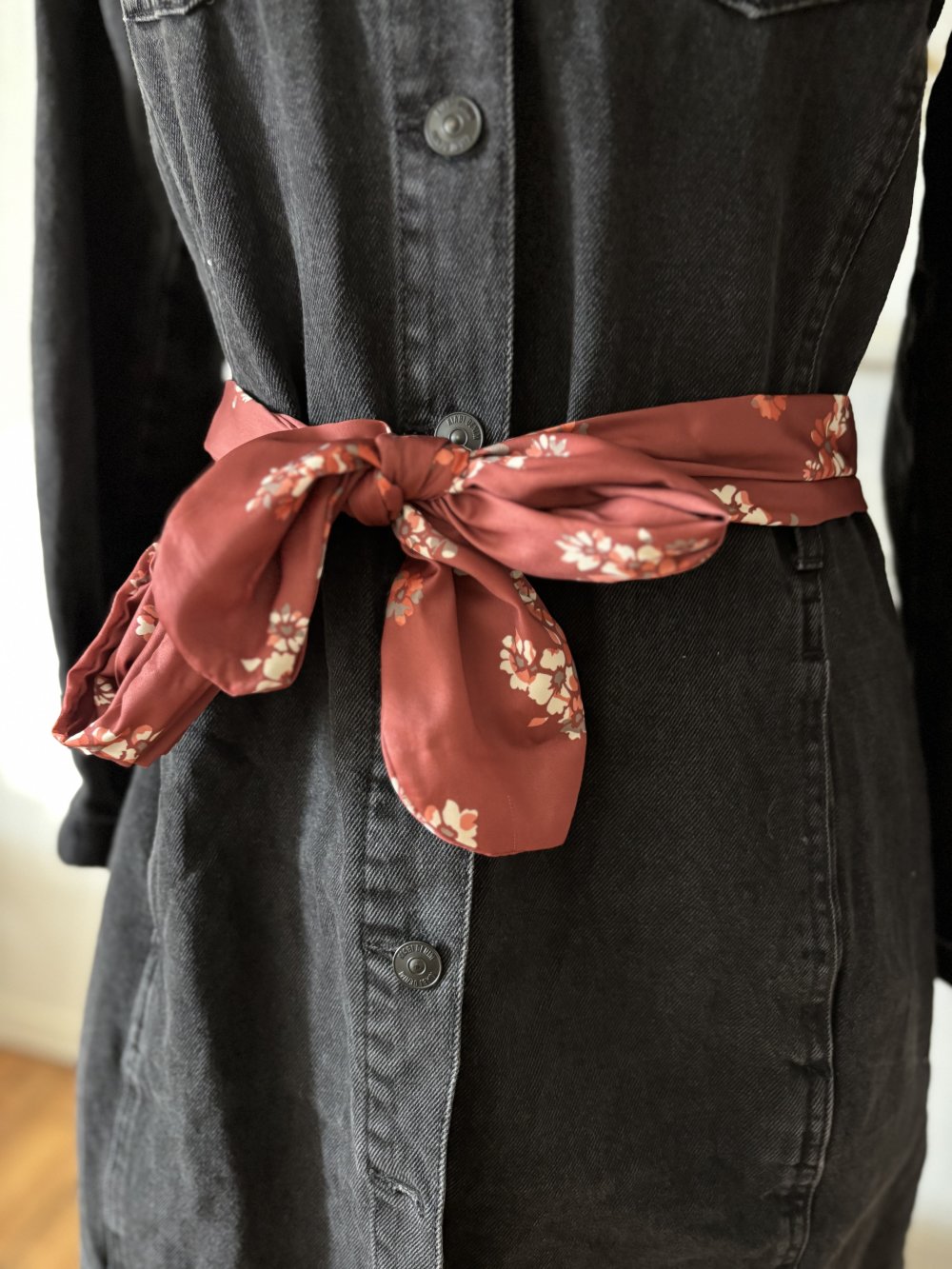 Ceinture déclinable à nouer autour de la taille, sur un pantalon, une robe etc... mais aussi en accessoire sac, dans les cheveux.
