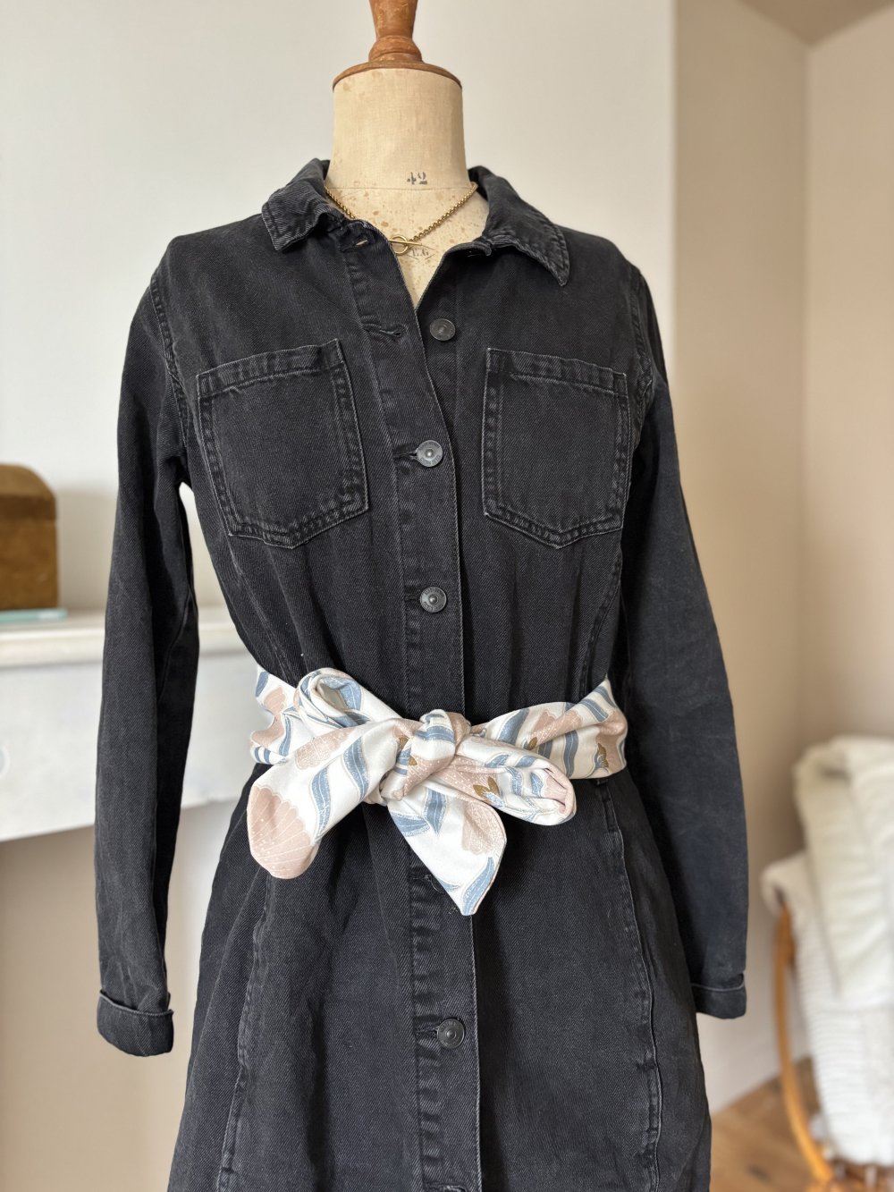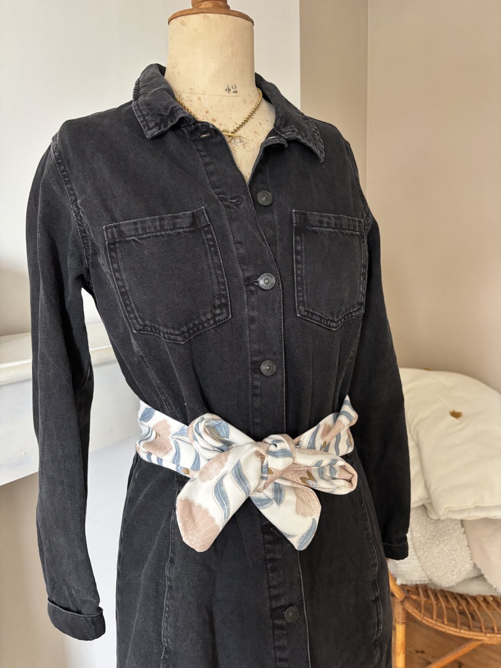 Ceinture déclinable à nouer autour de la taille, sur un pantalon, une robe etc... mais aussi en accessoire sac, dans les cheveux.