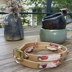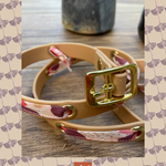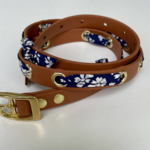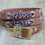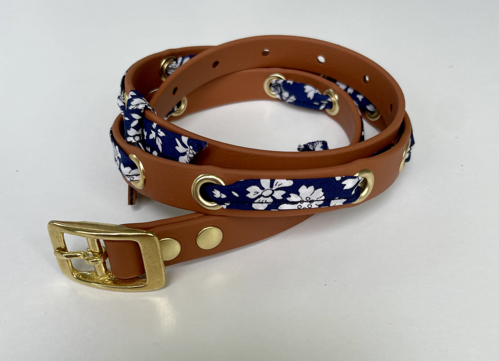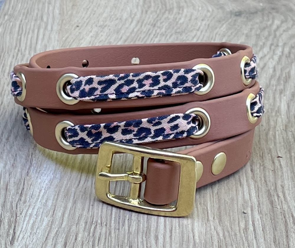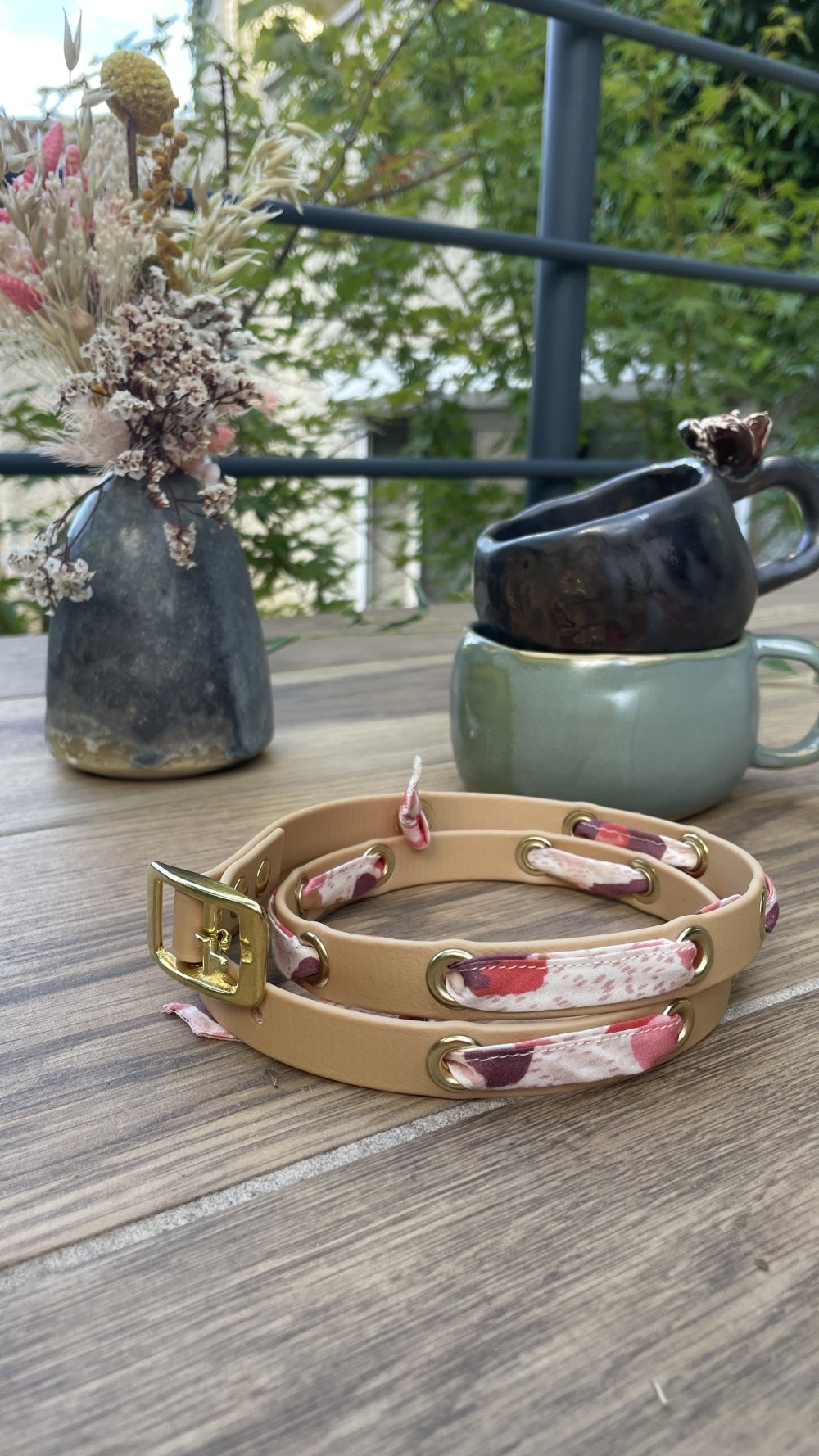 Coloris Biothane : Marron Clair / Tissu : LEO / Boucle : Laiton doré / Taille : 90 cm