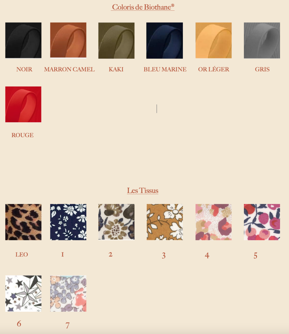 Le Biothane®, matière innovante, résistante et vegan, offrant une large gamme de coloris, se marie selon les modèles, à des tissus et cordons de qualité, choisis avec soin, pour donner naissance à des créations durables, pratiques et esthétiques.