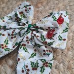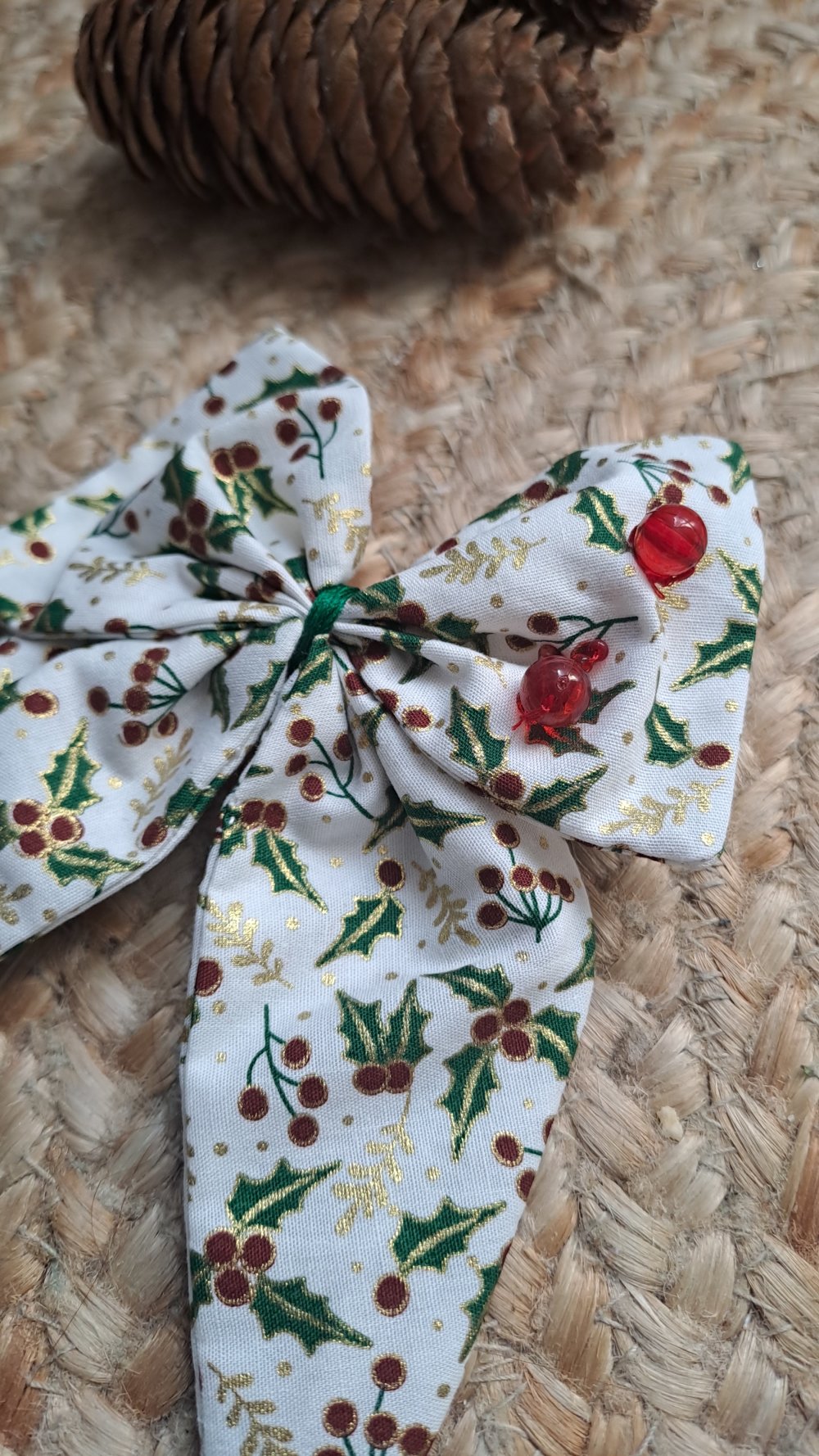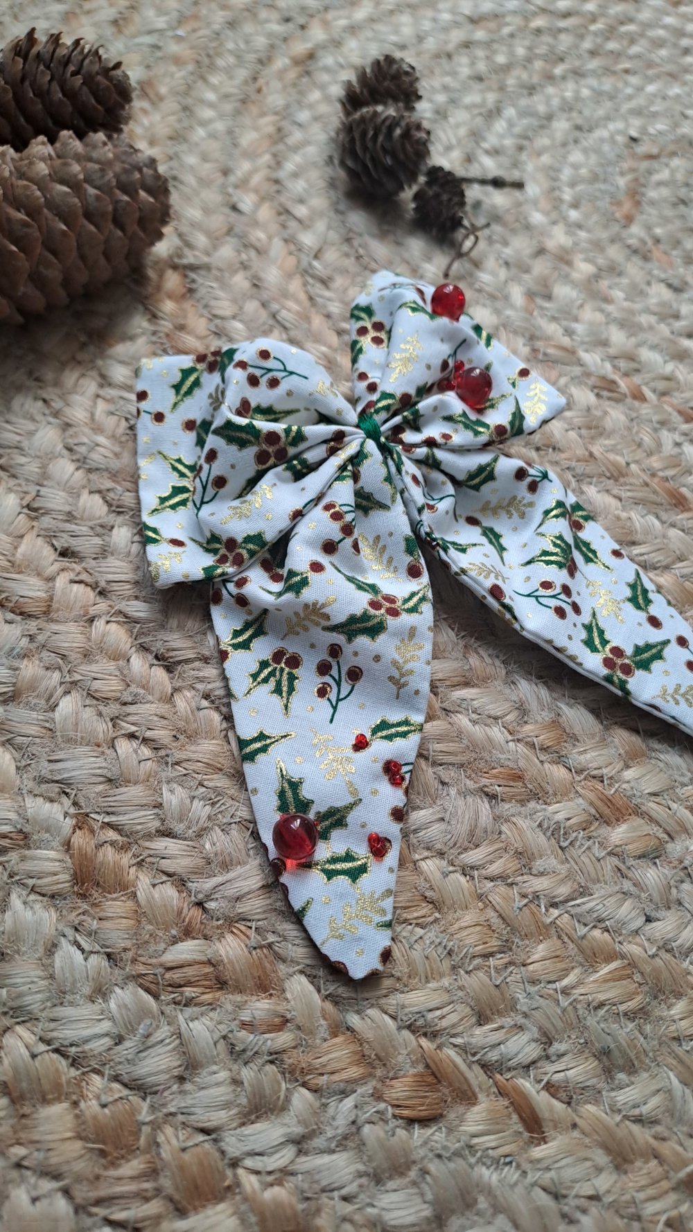 Je vous propose cette jolie barrette maxi nœud princesse pour petites fille ou adulte! Les mamans, osez les matchy matchy avec votre mini!!! pour sublimer la tenue de vos princesses le 25 décembre et le nouvel an. Cette grand barrette est réalisé dans un joli coton rétro popeline blanche à motifs de feuilles de houx ( petits liserets doré très chic, la pince à cheveux est rébrodée de petites perles rouge!!!