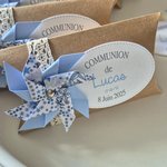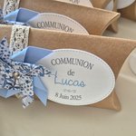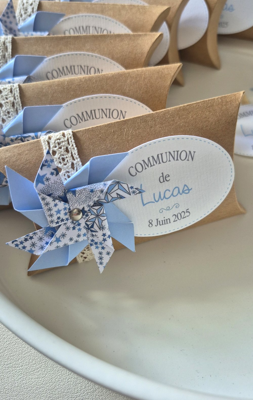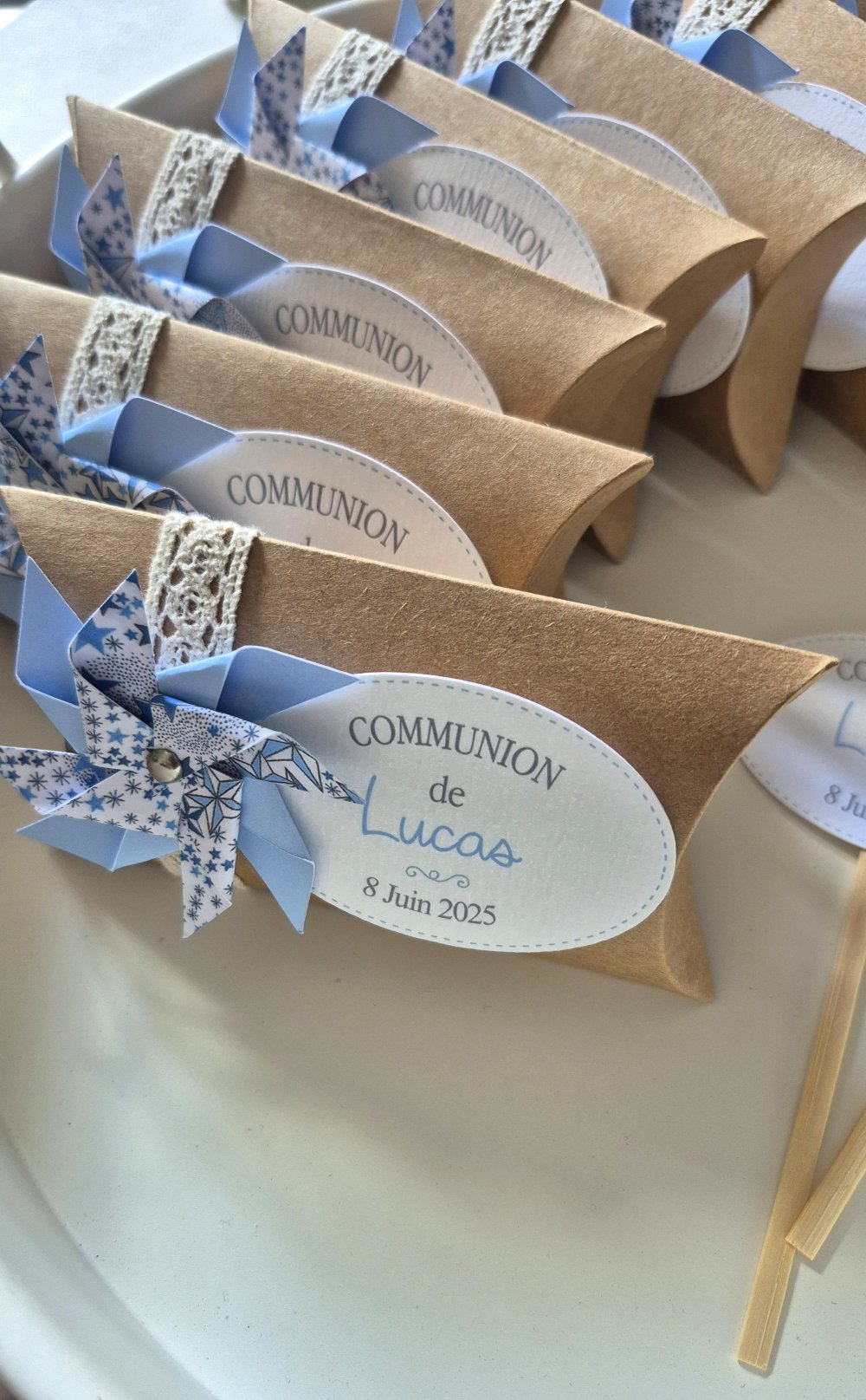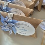 Boîte berlingot à dragée entièrement personnalisable tant au niveau des couleurs, des motifs, des polices d'écriture que des matières.