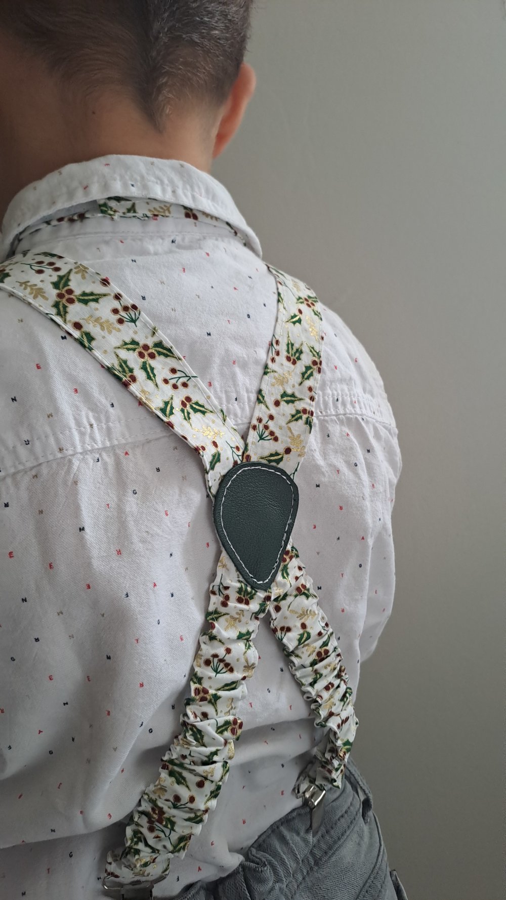Article : Nœud papillon Noël double volant popeline de coton motifs houx + bretelles élastique pinces crabe acier argent; triangle de cuir souple vert émeraude dos.