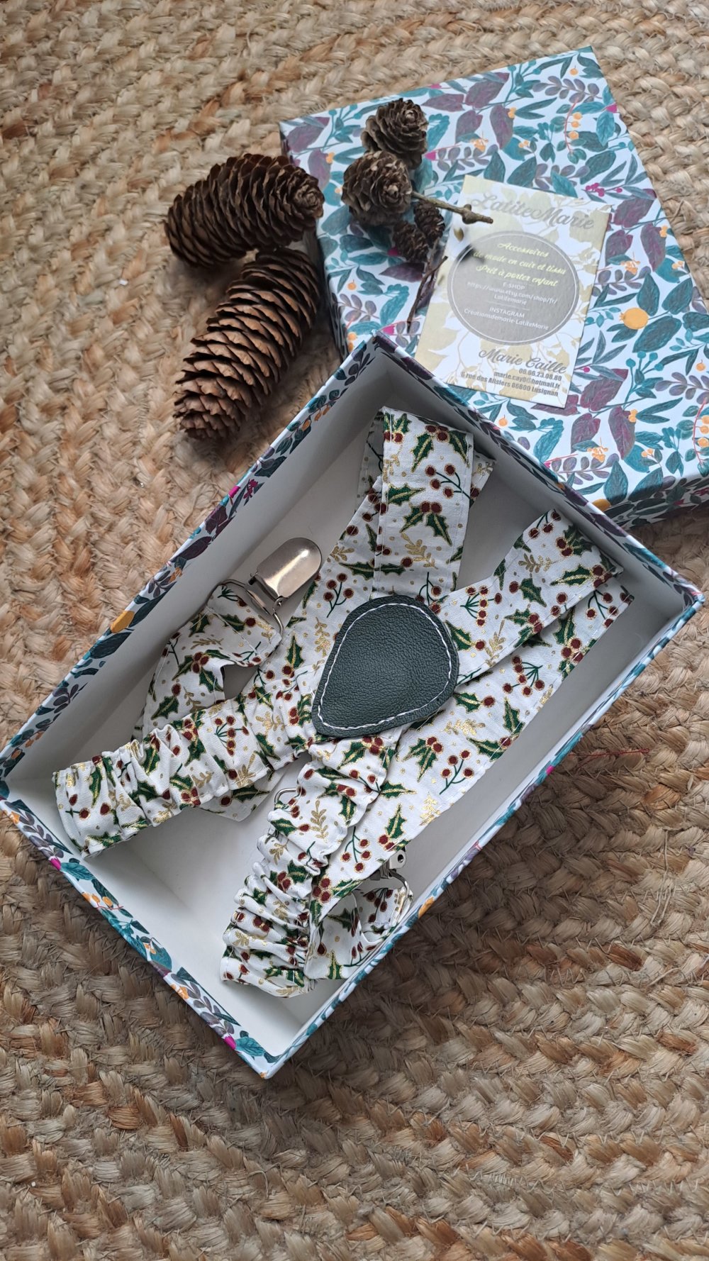 Accessoires tenue de fête Noel et réveillon, coffret nœud papillon et bretelles motifs houx