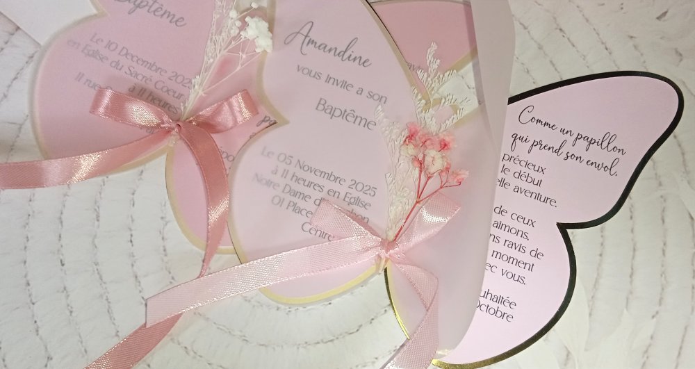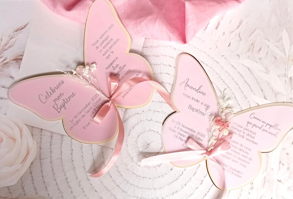 Offrez un souffle de poésie avec ce faire-part en forme de papillon, entièrement réalisé à la main.