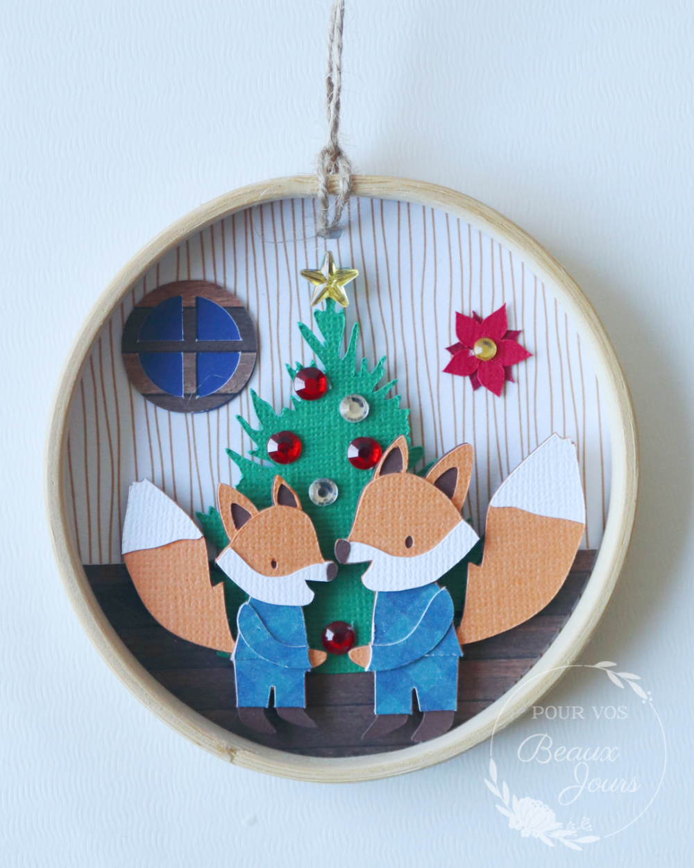 Par une belle soirée étoilée, Papa et petits renards parent le sapin de décorations de Noël