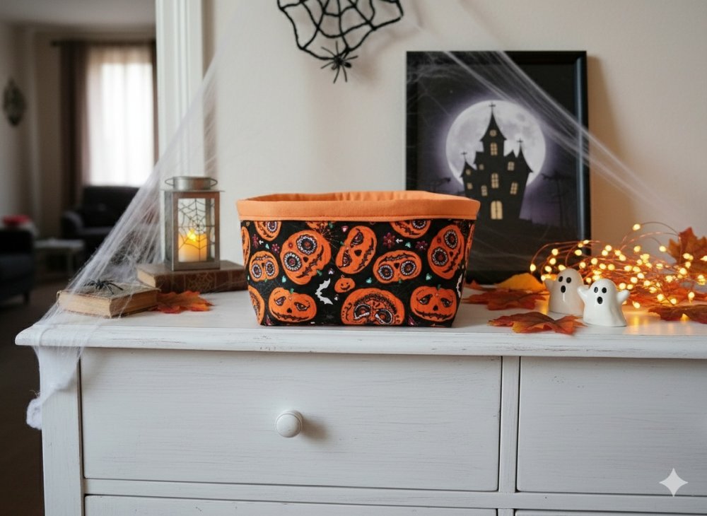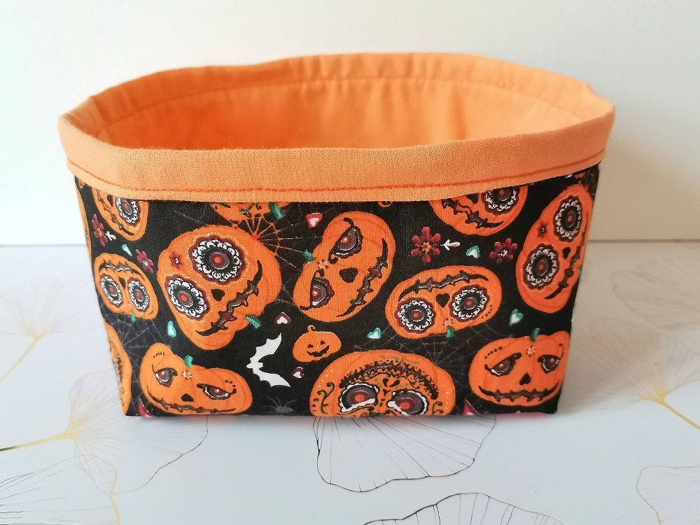 Petits paniers doublés en tissus orange coton et pour le tissus principal un tissu coton certifié Oeko-Tex sur le thème de Halloween.