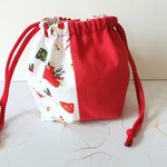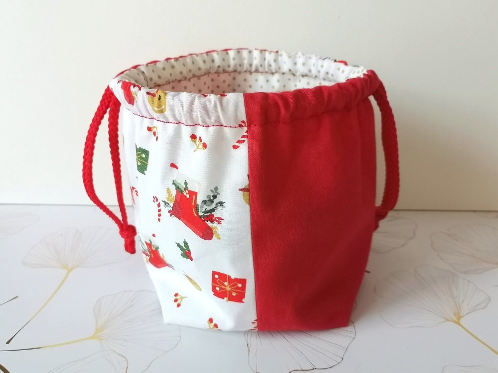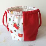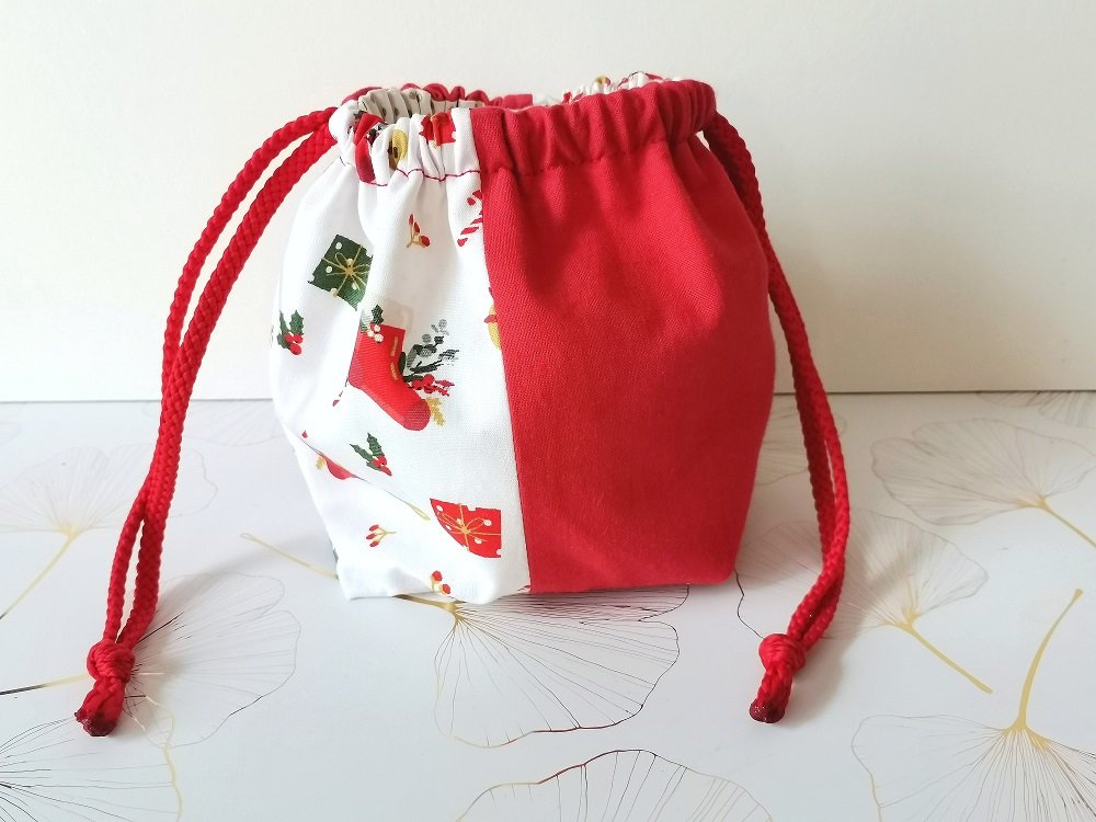 Petit sac pochon de noël à lien coulissant en tissus coton certifié Oeko-Tex de couleur rouge et blanc motif noël et rouge