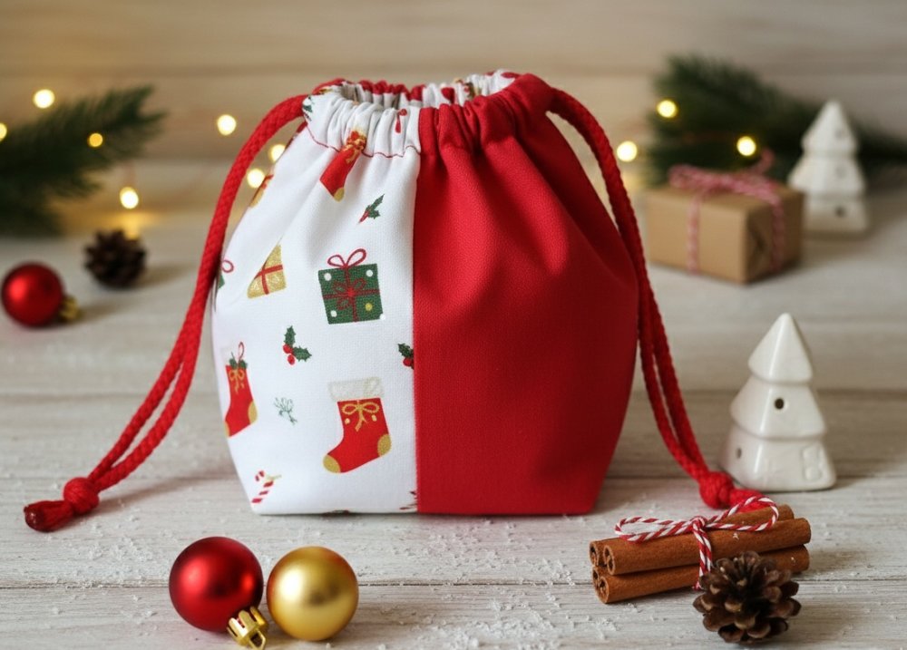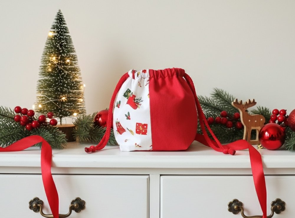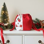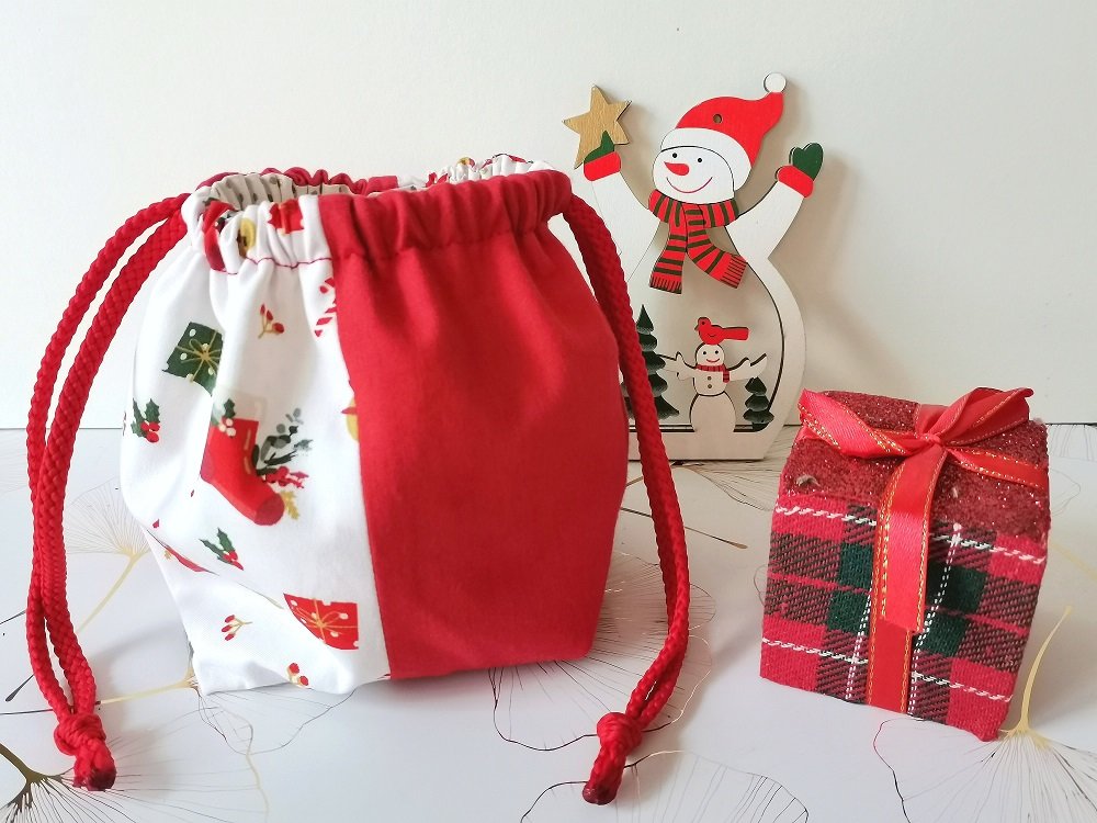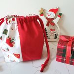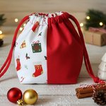 Petit sac pochon de noël à lien coulissant en tissus coton certifié Oeko-Tex de couleur rouge et blanc motif noël et rouge