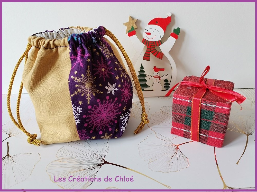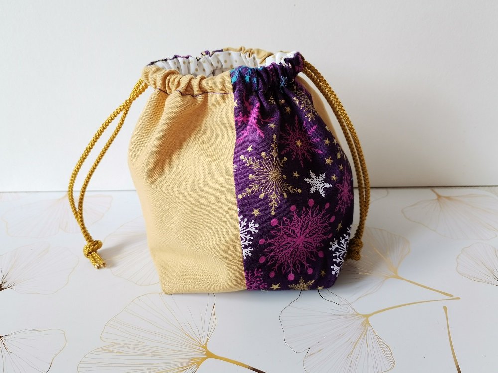 Petit sac pochon de noël à lien coulissant en tissus coton certifié Oeko-Tex de couleur moutarde uni et violet motif noël étoiles