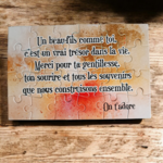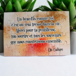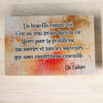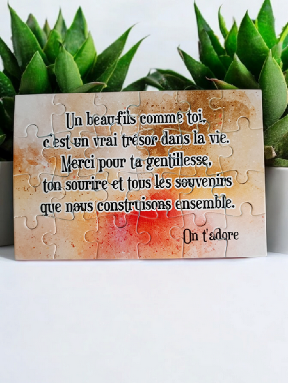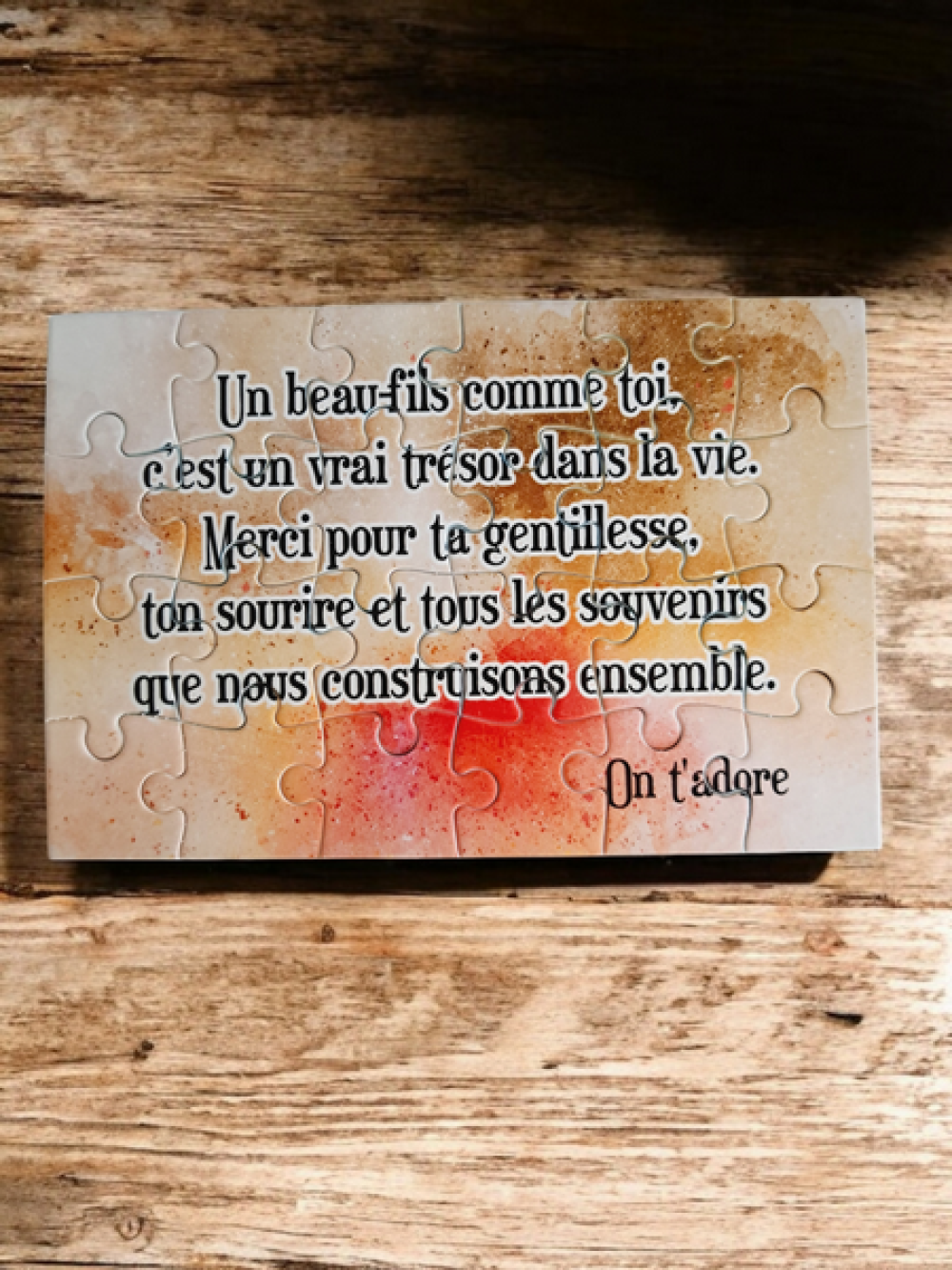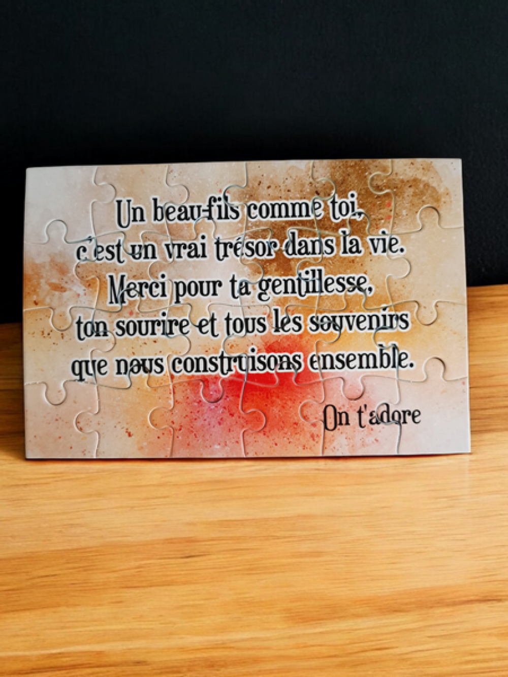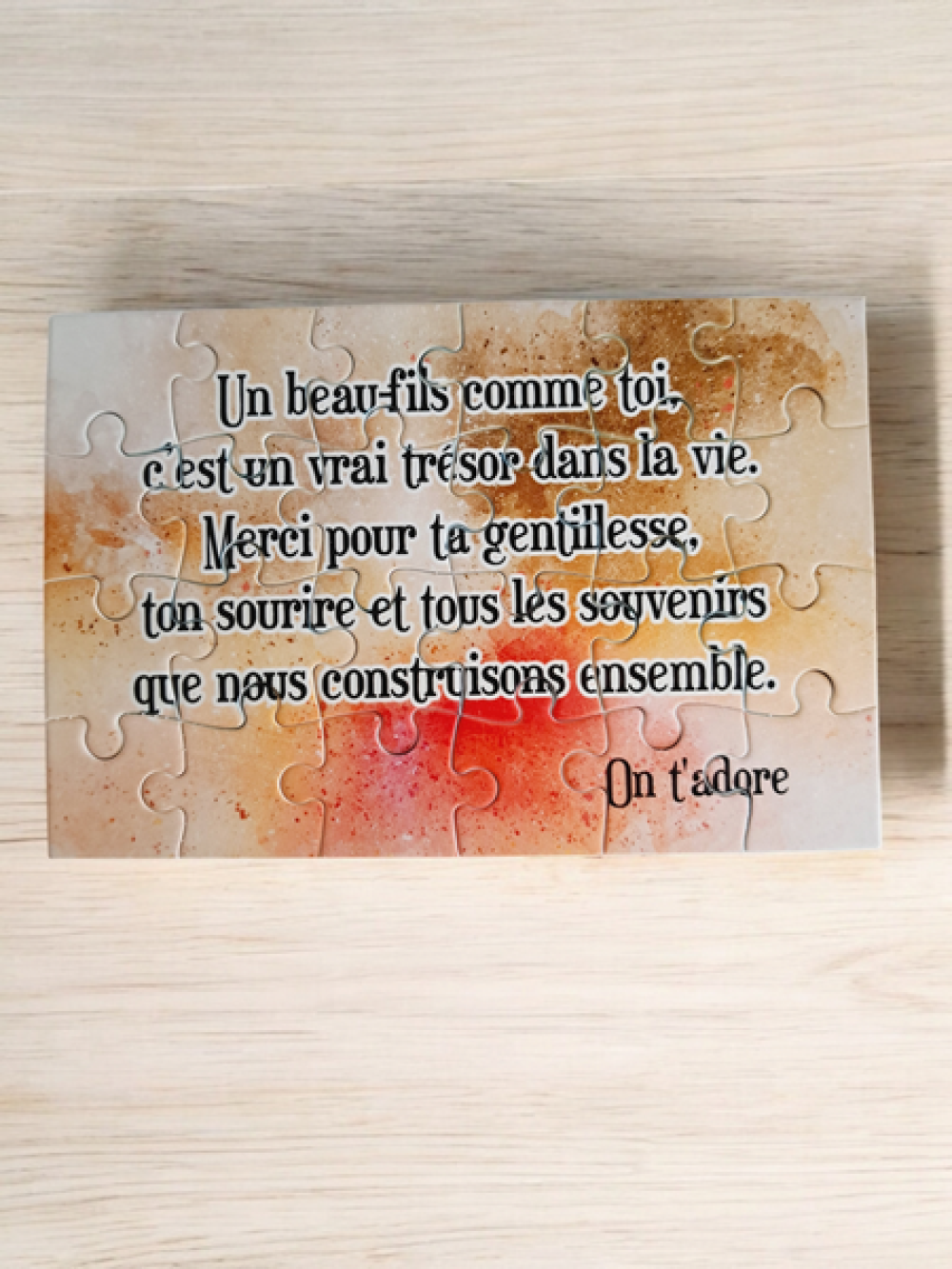 Surprenez votre beau-fils avec un puzzle personnalisé unique ! Avec ses dimensions de 16,5 cm x 11 cm et ses 24 pièces, ce puzzle cache un message chaleureux pour renforcer vos liens et exprimer votre affection. Offert dans un joli pochon, il est prêt à être offert pour créer un moment de partage inoubliable. Une attention originale qui ne manquera pas de toucher le cœur de votre beau-fils.