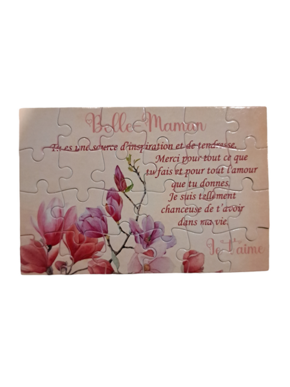 Découvrez le cadeau parfait pour Belle-maman ! Un puzzle de 24 pièces qui, une fois assemblé, révèle un joli message de tendresse. Ce puzzle personnalisé, mesurant 16,5 x 11 cm, est conçu pour créer des moments uniques et renforcer les liens familiaux. Offrez un souvenir rempli de douceur qui la touchera au cœur, accompagné d'un élégant pochon. Idéal pour toutes les occasions, ce puzzle est bien plus qu'un simple jeu : c’est un geste d’amour et de gratitude.